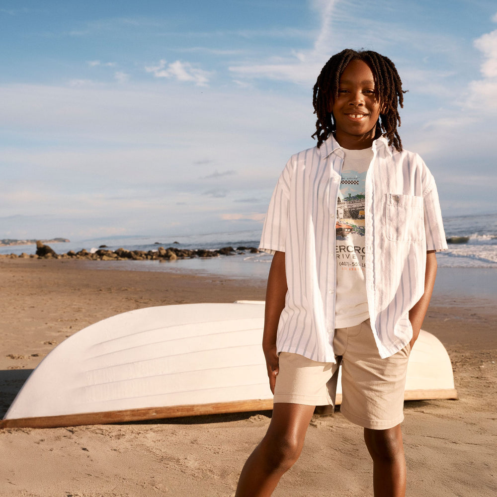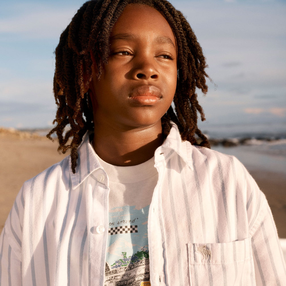 Cette chemise en coton tissé abercrombie kids est un essentiel de la garde-robe, suffisamment confortable pour être portée toute la journée, et ornée d’un imprimé rayé intégral. Elle présente une patte de boutonnage sur le devant, une poche poitrine, et peut se porter ouverte sur un débardeur ou un t-shirt, ou boutonnée seule.
