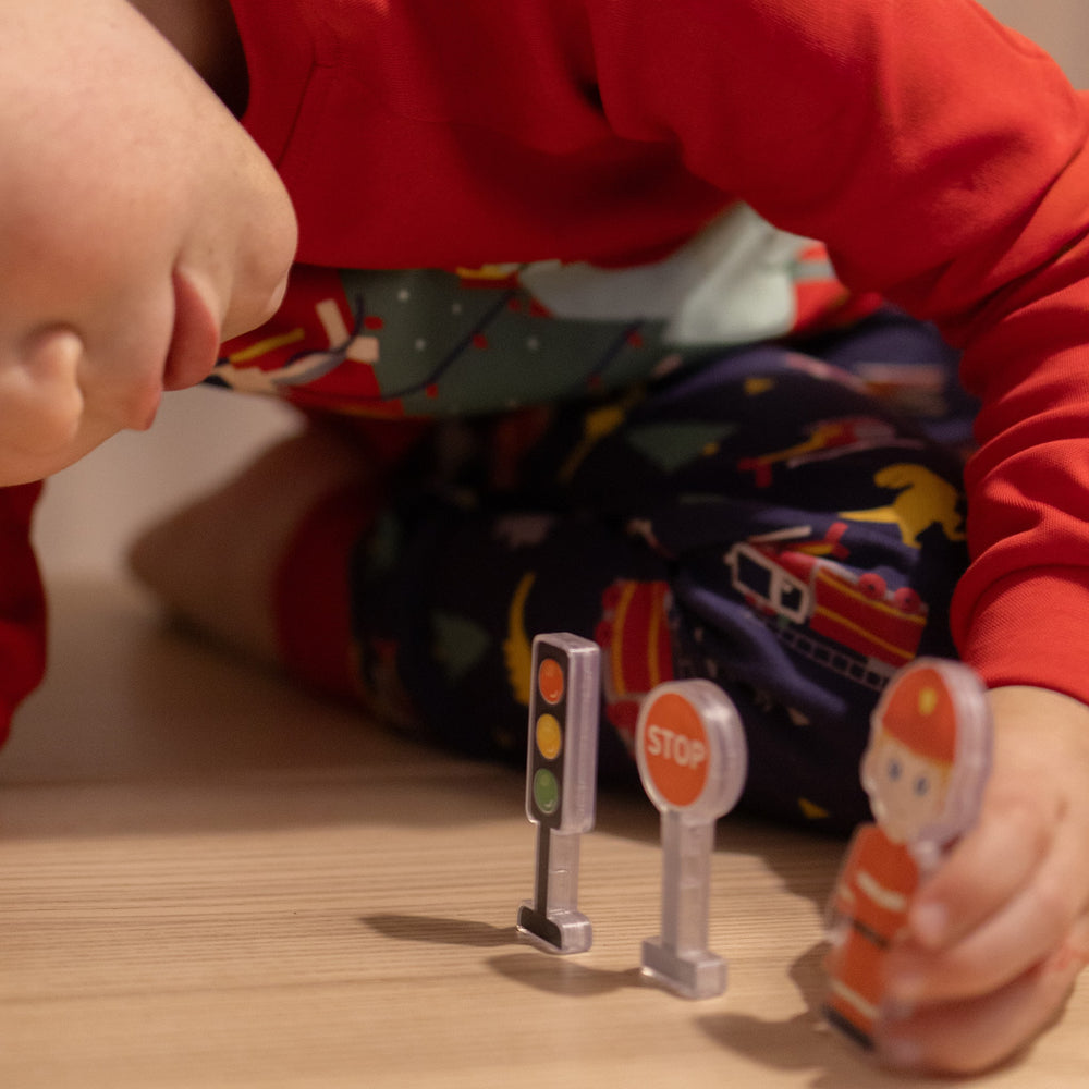 - Accessoires : 2 personnages pompiers, 2 camions d’intervention, 1 panneau STOP, barrières et outils de secours