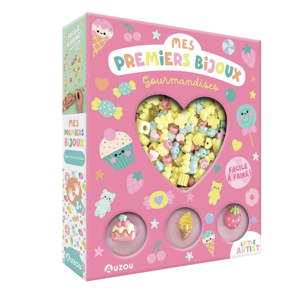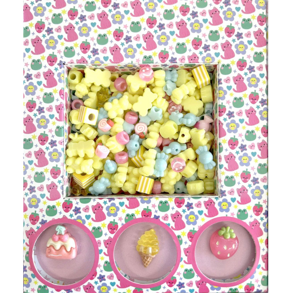 Le matériel et des explications pour réaliser des bijoux sur le thème de la gourmandise avec des perles fantaisie de couleurs et de formes différentes.