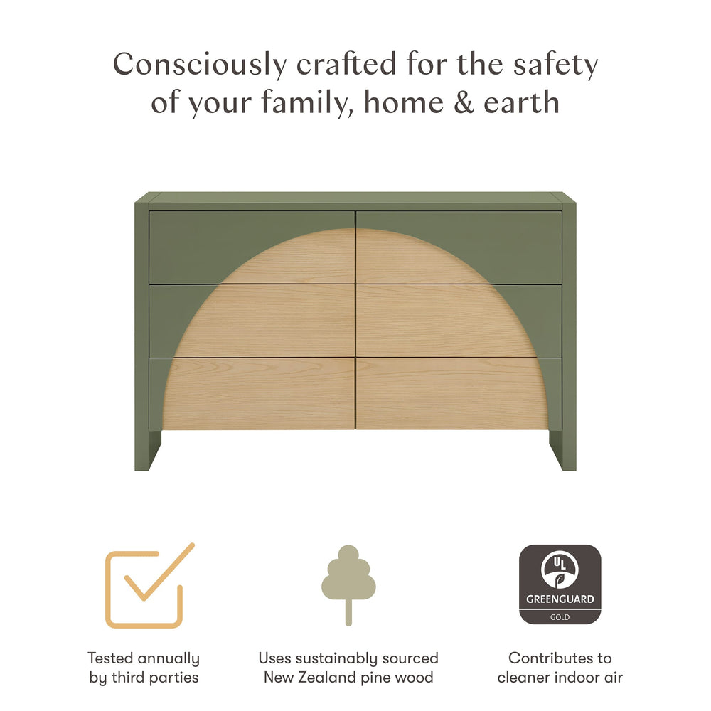 Avec sa façade arquée et ses accents en pin, la commode Moab rend hommage au pop art et au design postmoderne. Elle constitue une pièce à la fois stylée et sculpturale pour une chambre moderne. Transformez-la en ajoutant un plateau à langer amovible pour les premières années (référence #M0619 vendue séparément).