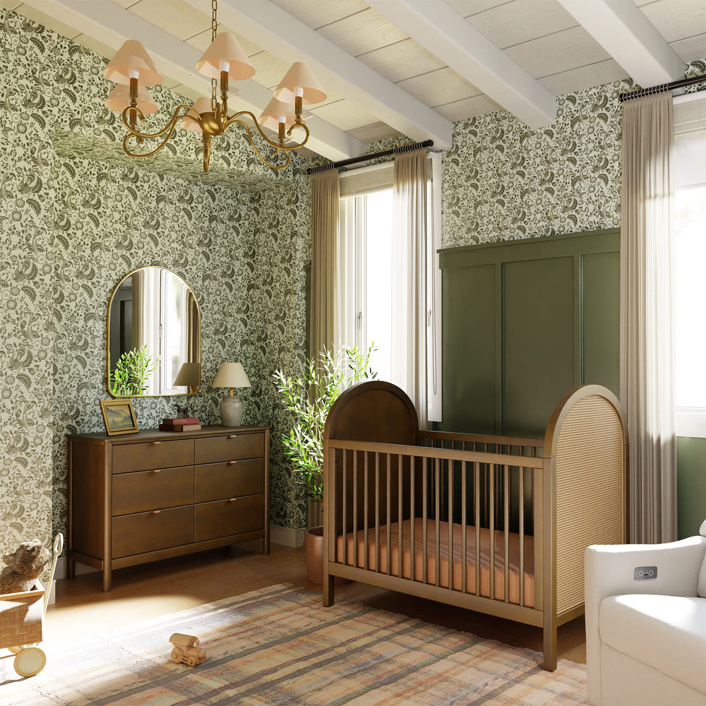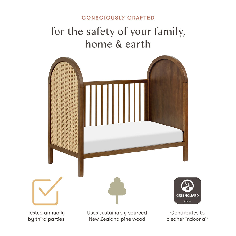 La couchette convertible 3-en-1 Bondi Cane célèbre le design d'inspiration bohème et les matériaux naturels avec son ton de bois chaud, ses panneaux latéraux arqués ludiques, ses pieds incurvés et sa canne tressée à base de plantes. Le Bondi est conçu pour grandir avec votre bébé à l'aide d'un rail de conversion pour lit d'enfant inclus et est testé pour les émissions chimiques nocives pour garantir qu'il répond à la certification GREENGUARD GOLD.