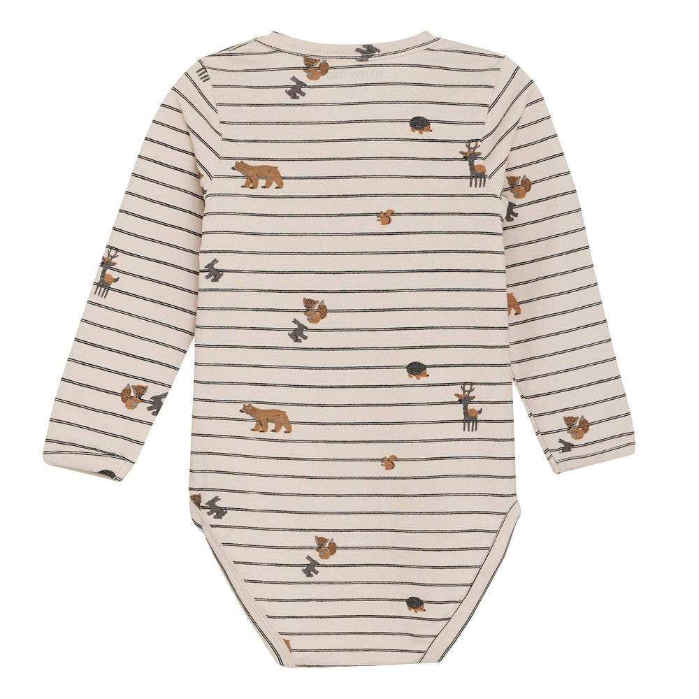 Adorable body à manches longues, orné de rayures et d'un adorable imprimé animal. Confectionné dans un tissu doux et confortable, il est doté de boutons-pression à l'entrejambe pour un enfilage facile.