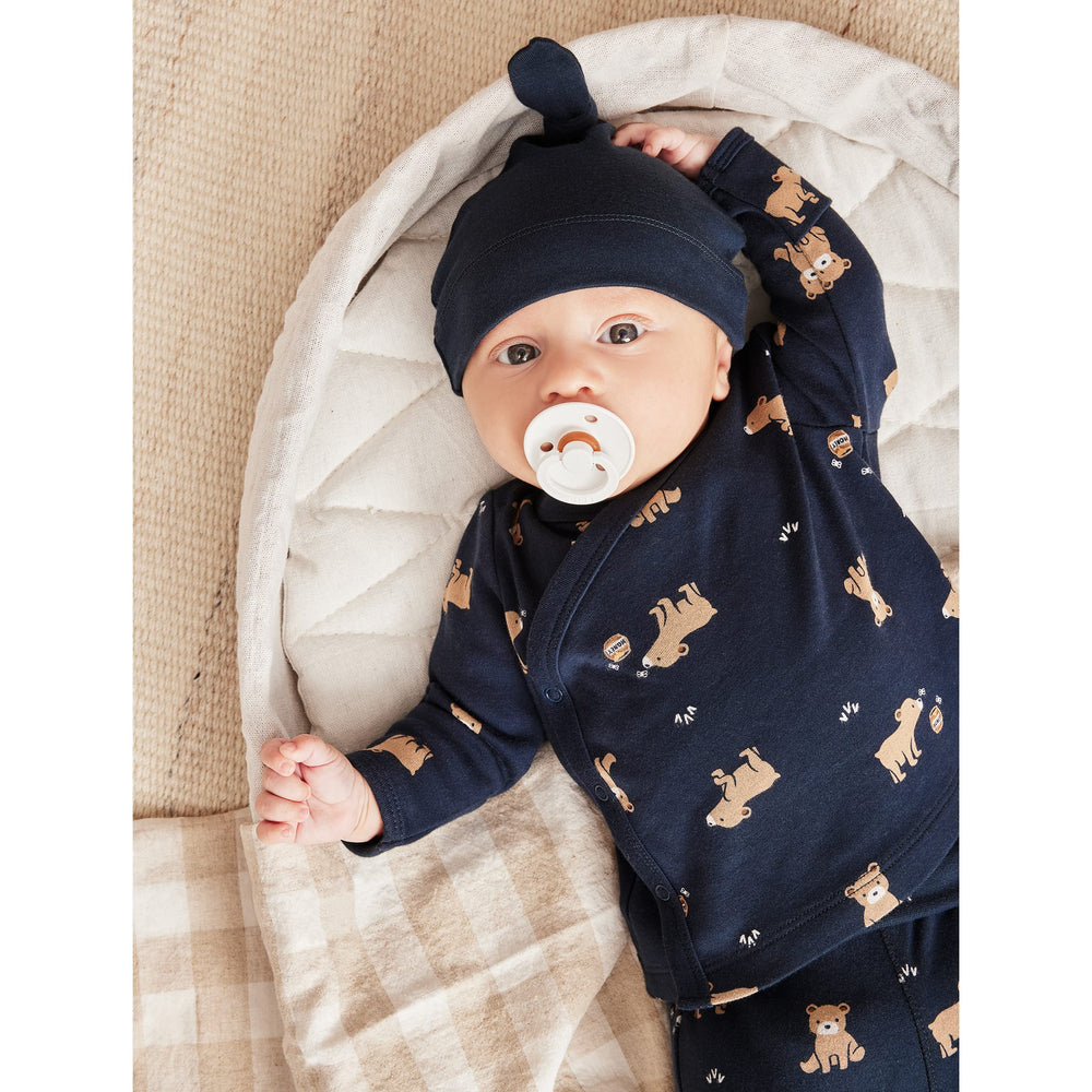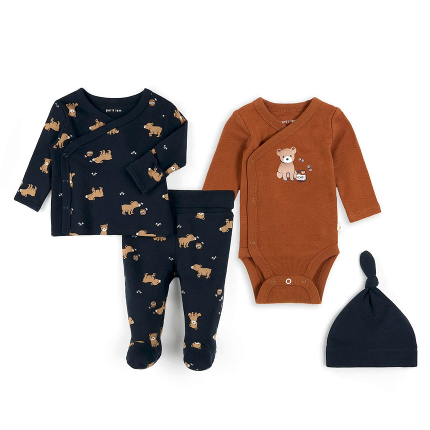 Cet ensemble est le cadeau idéal pour les parents qui ramèneront à la maison leur bébé arrivé un peu plus tôt que prévu ! Il est composé d’un cardigan orné d’oursons, d’un legging à pieds intégrés, d’un cache-couches à manches longues et d’une tuque assortie. Cet ensemble a tout ce dont vous avez besoin pour votre nouveau-né.