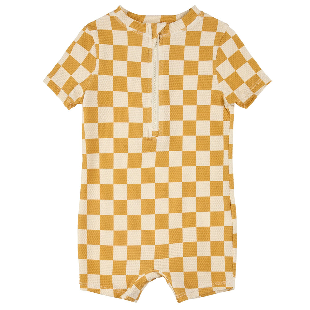 Brillante et joyeuse, comme un petit rayon de soleil, cette barboteuse de bain à carreaux est le vêtement parfait pour vos prochaines vacances en famille. Avec des maillots de bain assortis disponibles pour toute la famille, ce modèle orange permettra à votre tout-petit de se sentir impliqué dans tous les jeux de bord de mer, même s'il est trop petit pour aller dans l'eau. Le tissu gaufré texturé assure un confort toute la journée et sèche rapidement, facilitant la transition entre les éclaboussures et les jeux dans le sable. La fermeture éclair à l'avant ouvre légèrement l'encolure pour simplifier l'habillage et le changement.