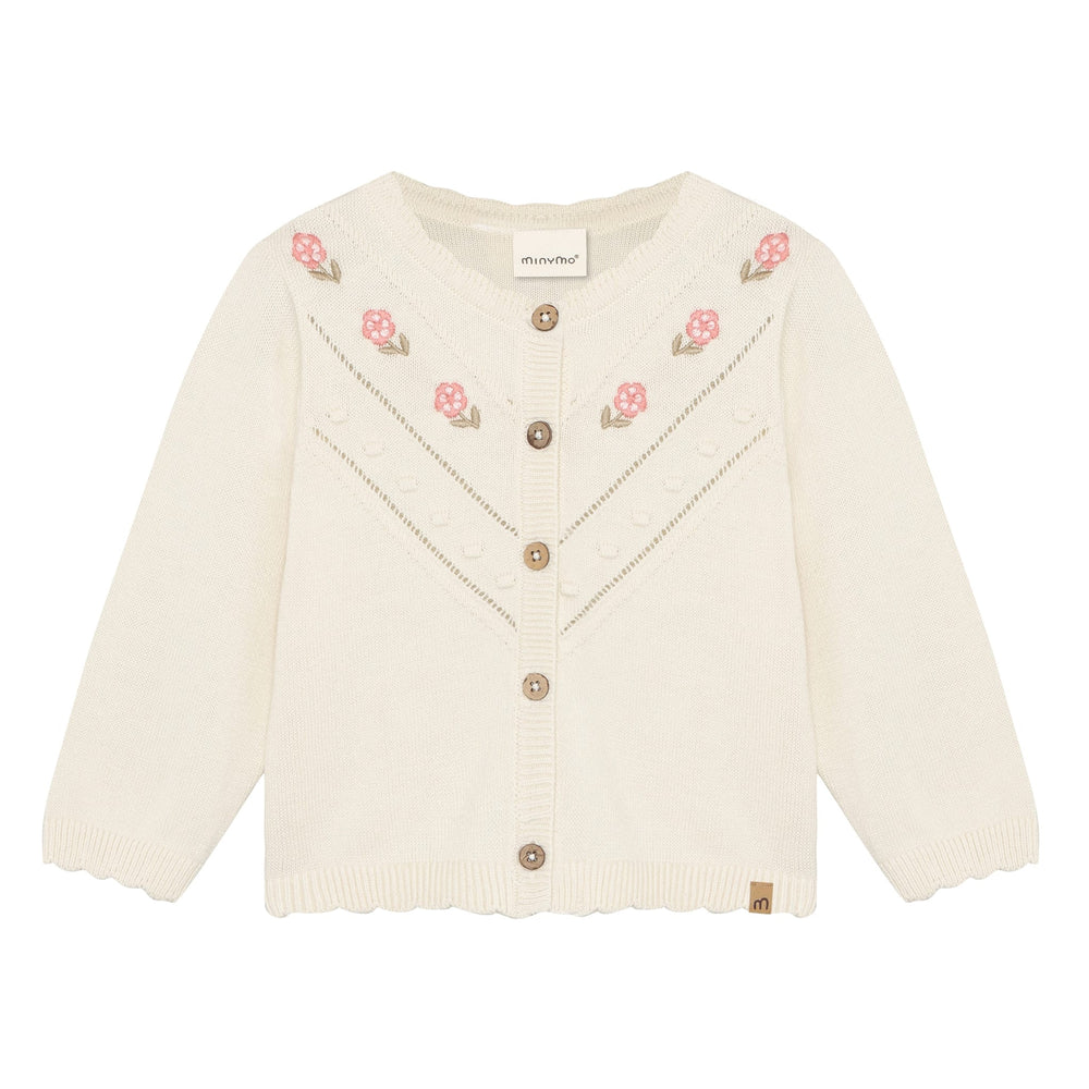 Gilet en maille Minymo. Ce gilet uni présente un motif brodé en V sur la poitrine. Il est doté de bords-côtes ondulés aux manches, au col et à l'ourlet. Fermeture boutonnée sur le devant. Fabriqué en coton 100 % biologique certifié. Certifié GOTS - biologique CERES-0366.
