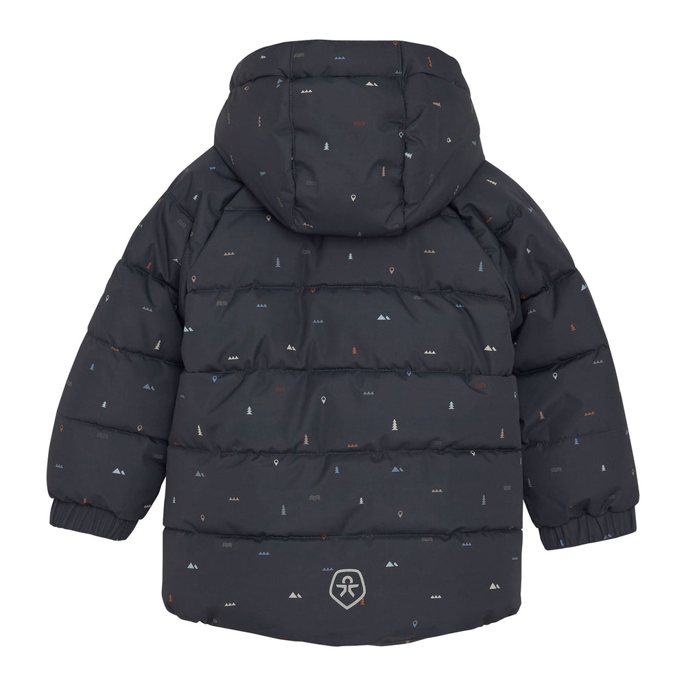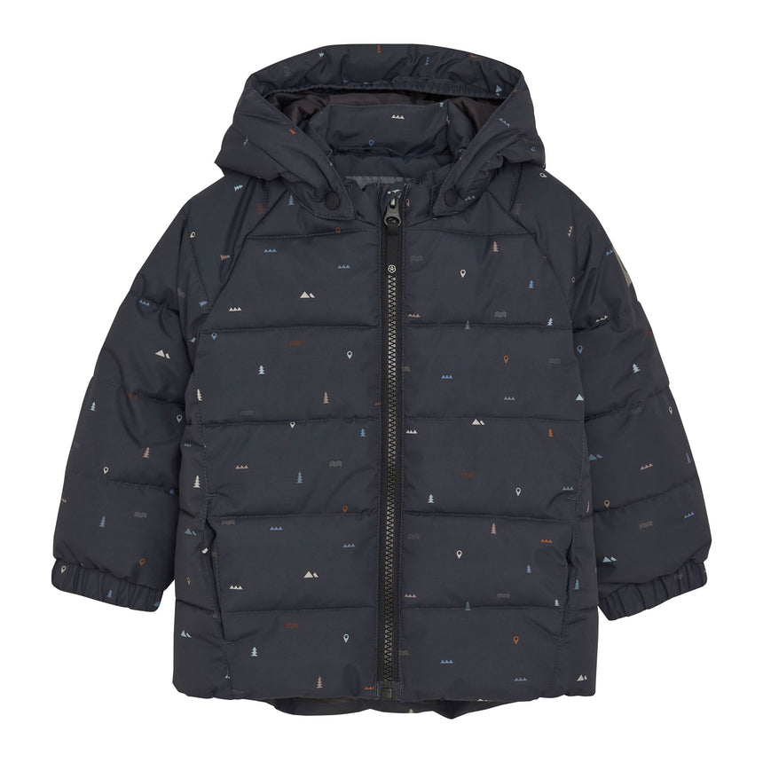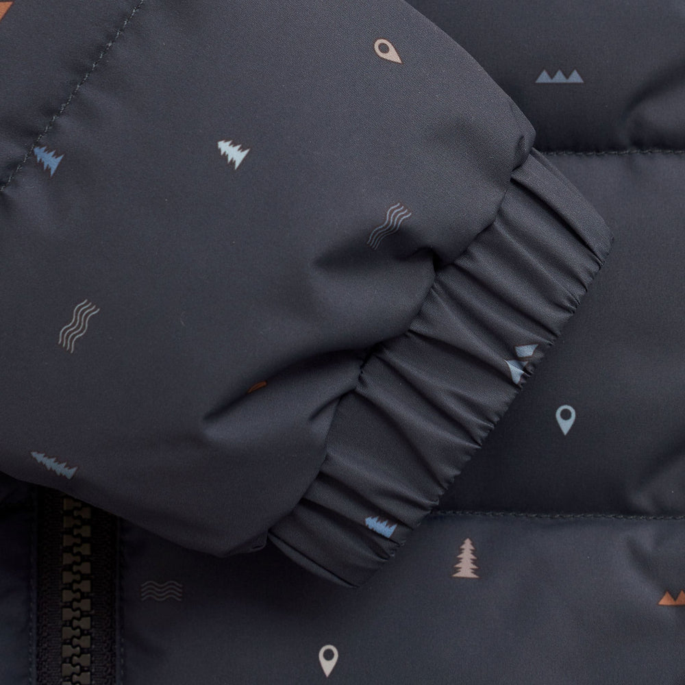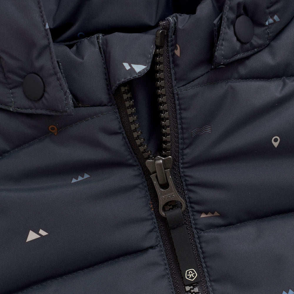Veste matelassée chaude à imprimé intégral, fabriquée dans une matière durable et partiellement recyclée. Respirante, coupe-vent et imperméable, elle permet à votre enfant de rester dehors sous la pluie, la neige et le vent sans avoir froid ni se mouiller. Résistance à l'usure testée à 20 000 frottements, pression de colonne d'eau à 8 000 mm et respirabilité à 3 000 g. La veste se ferme par des zips de qualité à l'avant et aux poches extérieures. Le protège-menton assure une sensation de douceur sous le menton. La veste est dotée d'une capuche amovible. Détails réfléchissants au dos et sur la manche pour une meilleure visibilité. Étiquette nominative intérieure pour une identification facile. Revêtement BIONIC FINISH® ECO. Certifié GRS - Fabriqué avec plus de 50 % de matériaux recyclés.