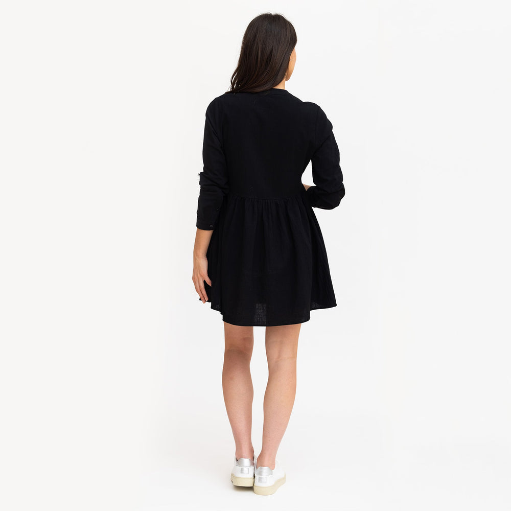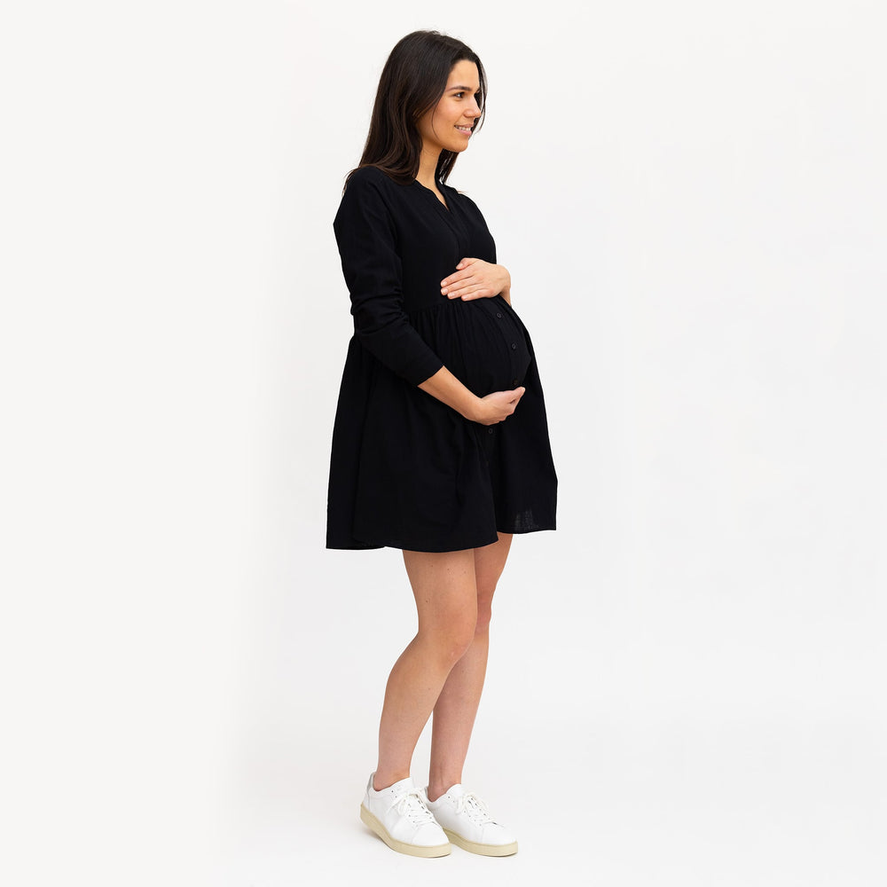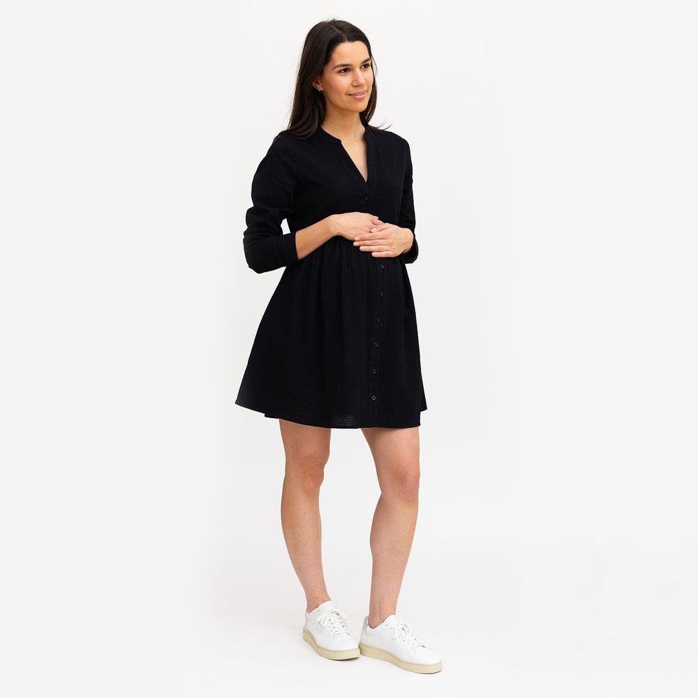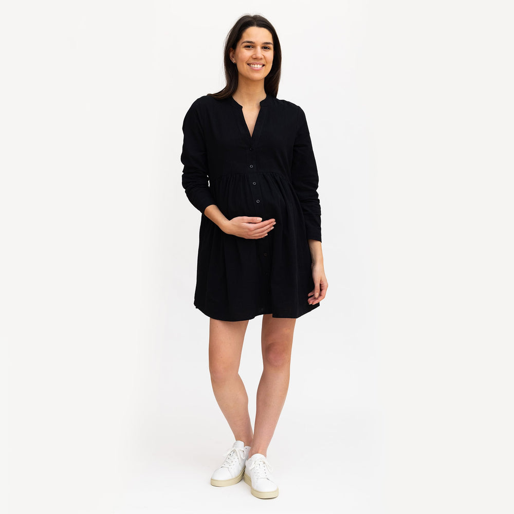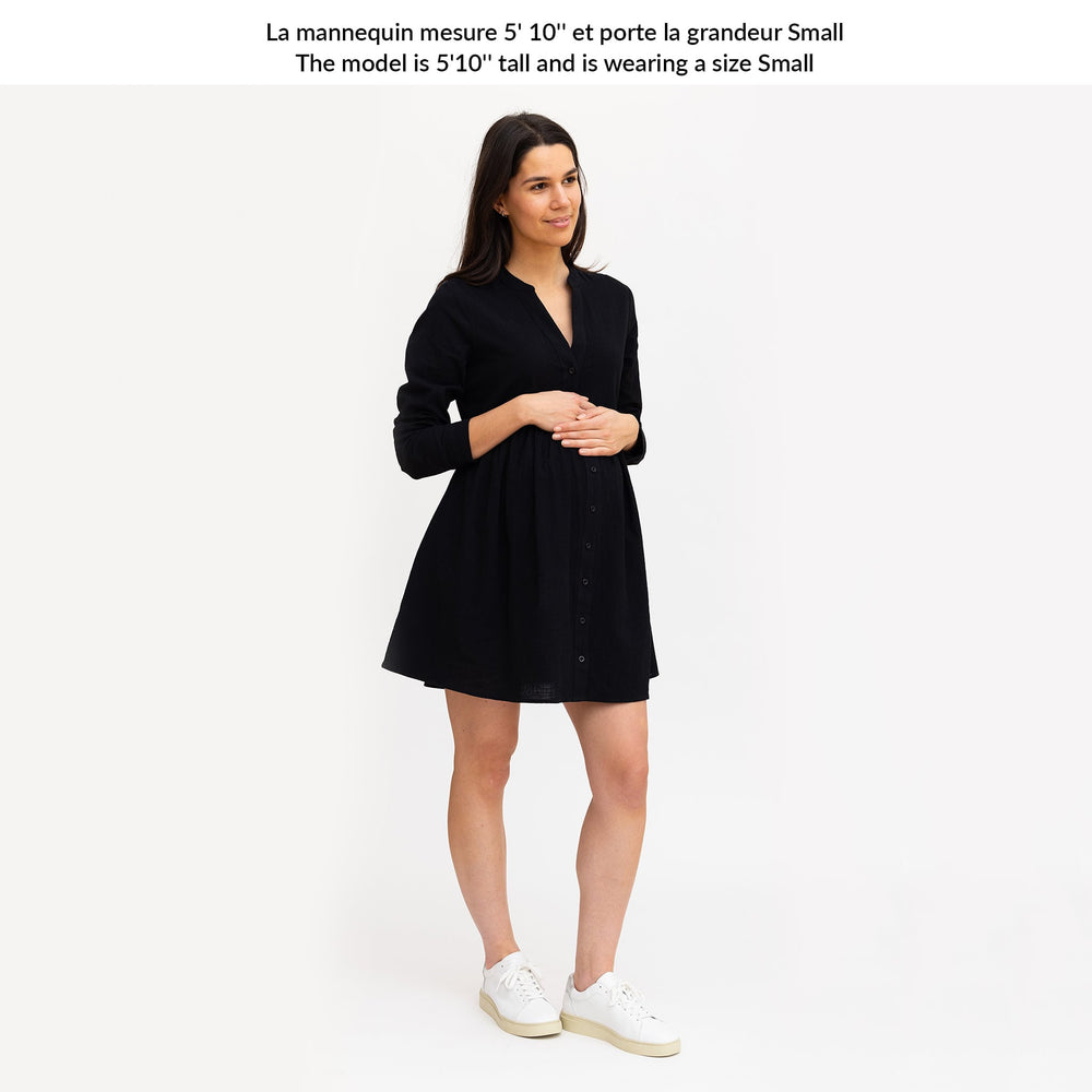 Cette robe effet lin présente une polyvalence remarquable, adaptée à toutes les silhouettes, pour un confort optimal tant pendant la grossesse qu'après, alliant élégance et confort.