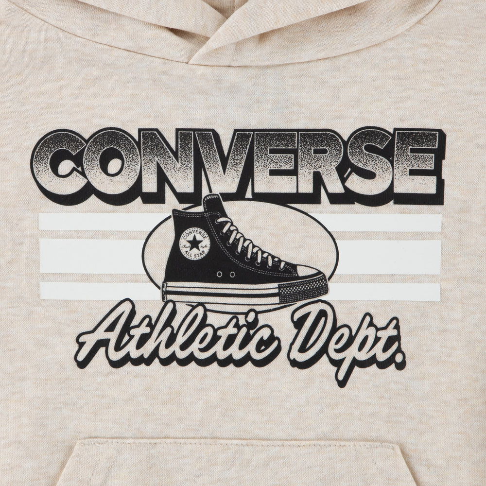 Habillez facilement votre petit All Star avec style et confort grâce à cet ensemble deux pièces en molleton français. Le hoodie présente un graphique mettant en vedette une basket Chuck Taylor accompagné du logo wordmark, et ses épaules tombantes offrent une coupe décontractée. Le pantalon jogger assorti possède une taille élastique pour un ajustement confortable ainsi que des jambes fuselées et décontractées qui mettent en valeur les chaussures préférées de votre enfant.