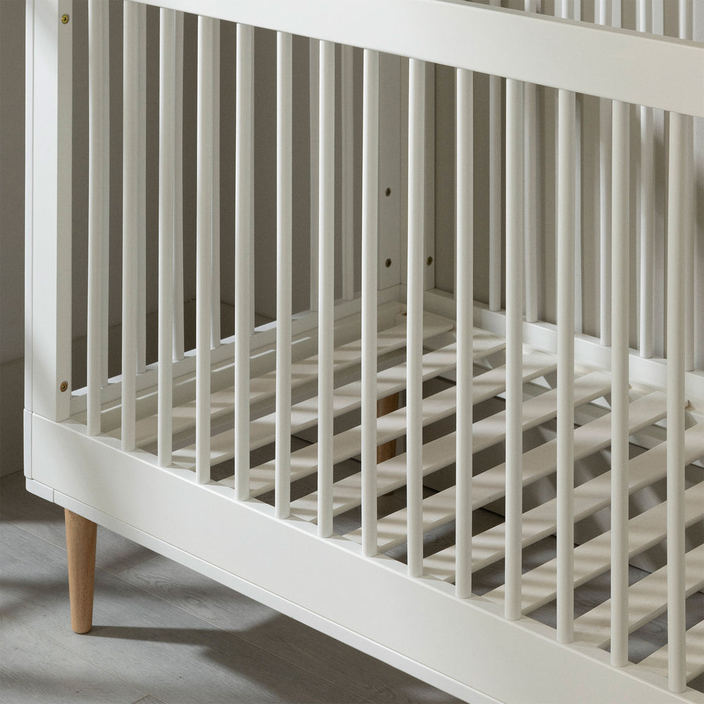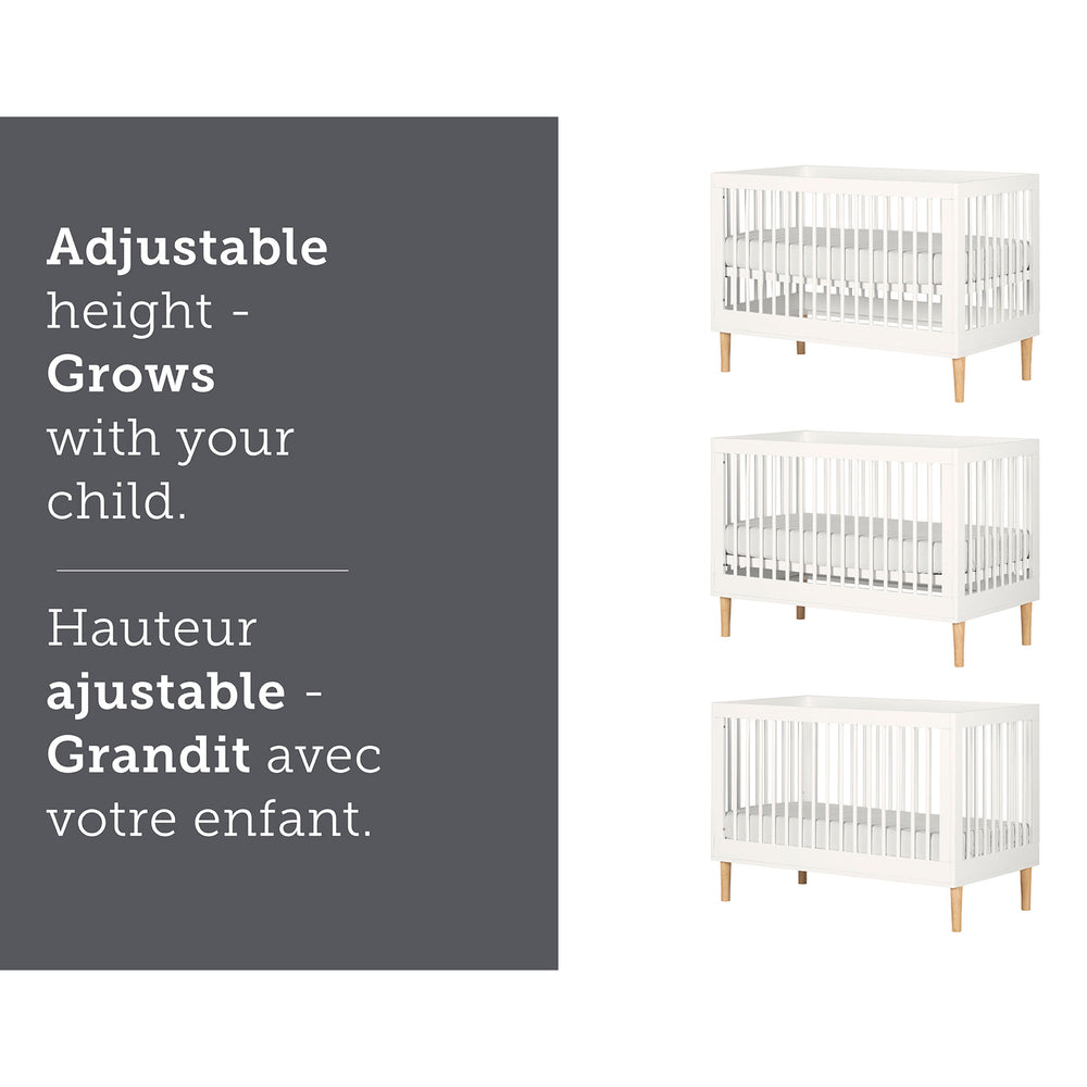 Comme les bébés grandissent super vite, il est important d’opter pour des meubles qui vont perdurer dans le temps. Ce lit de bébé est un véritable 3 en 1! Il est à la fois, une couchette, un lit de transition, et un petit lit sans bord. Il évoluera avec votre enfant, de nouveau-né à bambin! Pour ce faire, vous n’avez qu’à remplacer les barreaux à l’avant par une barre de transition (non-incluse), puis l’enlever une fois que bébé est devenu grand.