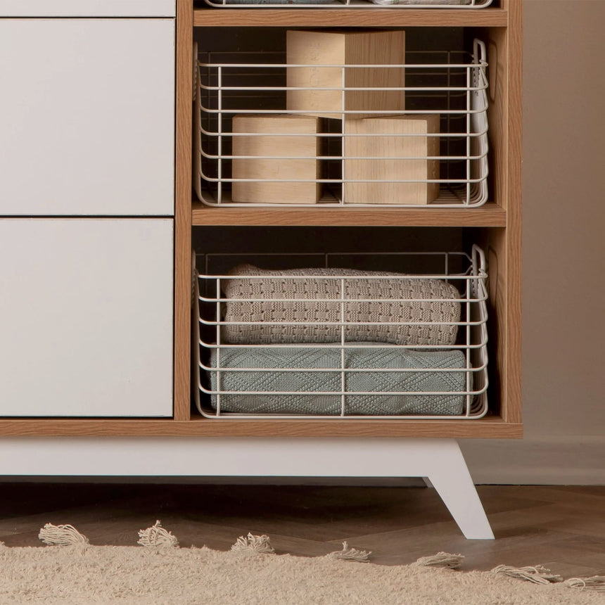 Rangez les articles d’usage fréquent dans des paniers en fil métallique faciles d’accès (vendus séparément) ou gardez les jouets de votre tout-petit à portée de main ! Sécurisée, stable et robuste, elle est dotée de pieds inclinés solides, d’un support en acier forgé et de tiroirs profonds.