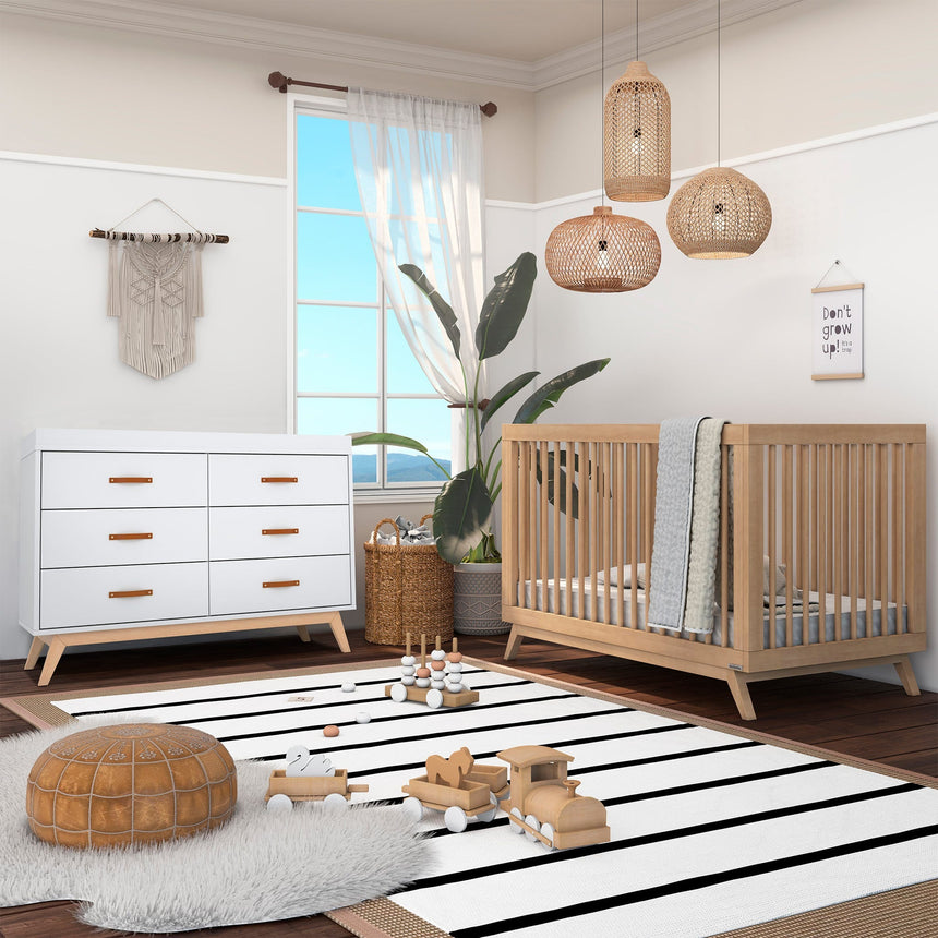 La commode moderne Soho 5 tiroirs de 48 pouces s'accorde parfaitement avec le lit convertible 3-en-1 Soho, ou ajoute une touche de style du milieu du siècle à n'importe quelle pièce par elle-même. Sûre, stable et solide, avec des pieds robustes inclinés, des poignées en bois massif, un support en acier forgé et une finition peinte sans danger pour le bébé.