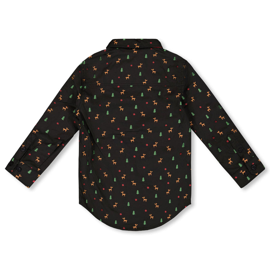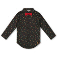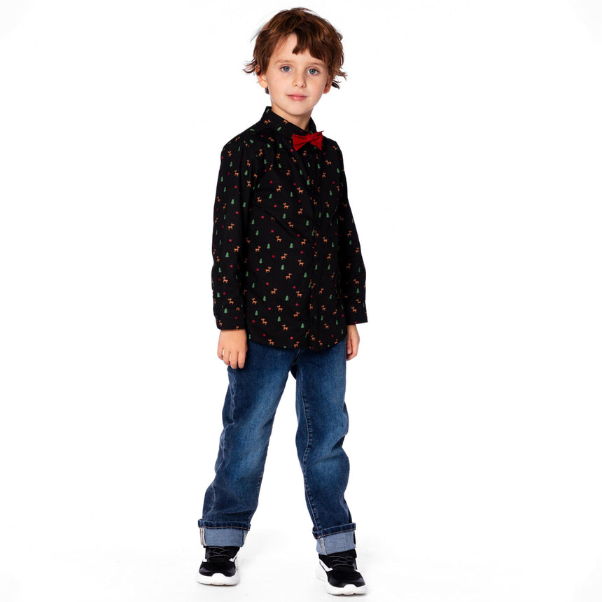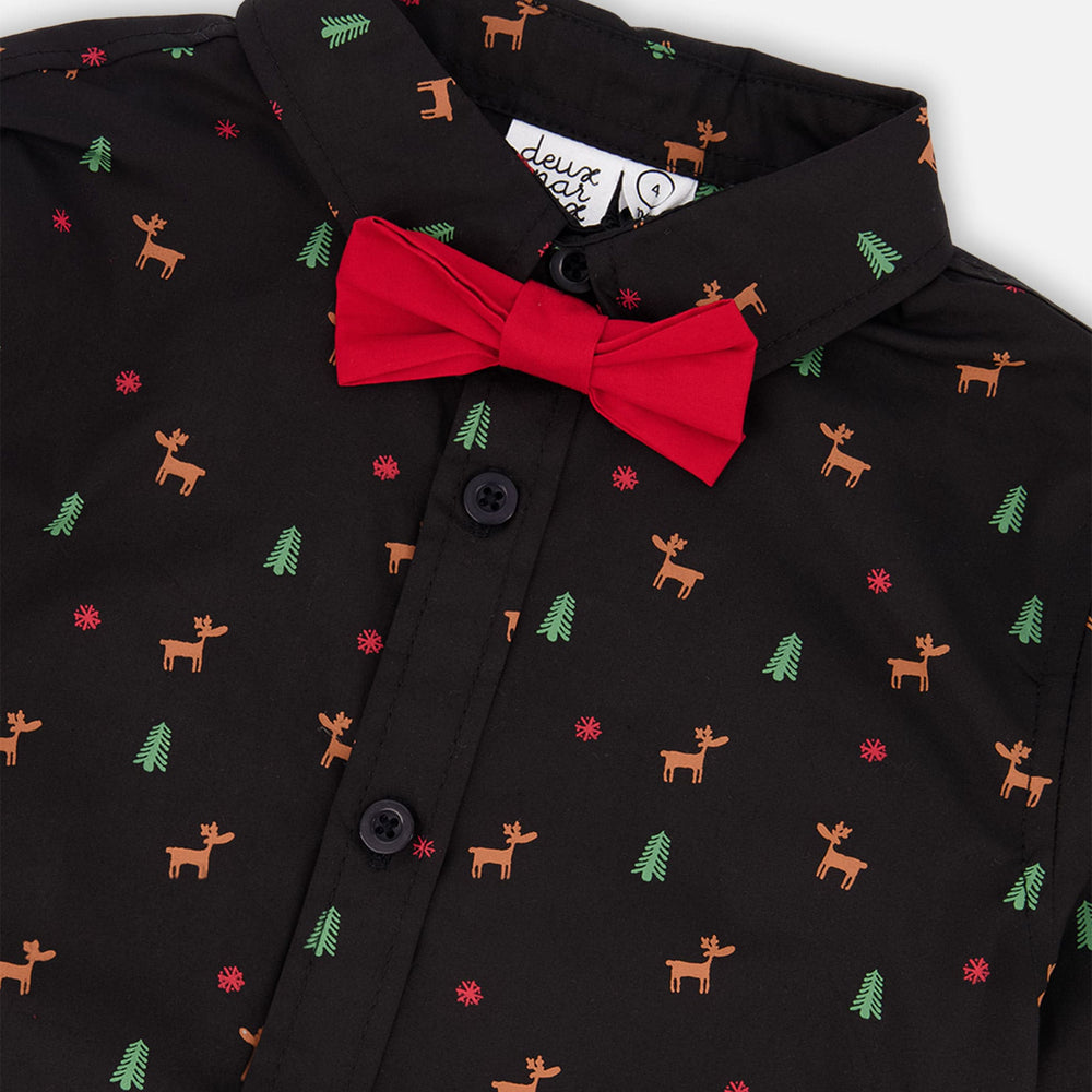 Notre chemise popeline imprimée noir et multicolore avec nœud papillon est une pièce pleine d’élégance pour les célébrations. Confectionnée en popeline de coton, cette chemise à manches longues se distingue par son col chemise classique, sa fermeture boutonnée sur le devant et son nœud papillon rouge cousu à l’encolure. Son imprimé intégral festif composé de petits cerfs et sapins en fait un incontournable pour les fêtes.