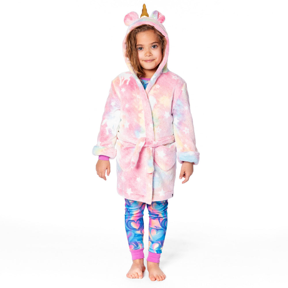 Après le bain, avant le coucher ou lors des matins frisquets, ce peignoir qui brille dans le noir met de la couleur dans les petits moments à la maison ! Confectionné en tissu peluche ultra-doux, ce peignoir a une silhouette portefeuille avec manches longues, un capuchon à oreilles et corne de licorne, une ceinture à nouer et des poches en forme de cœur pour une touche ludique.