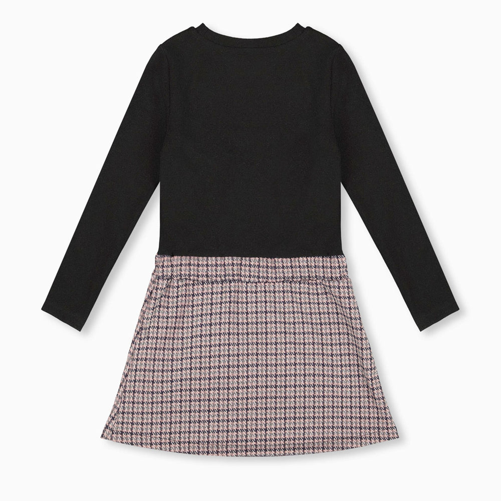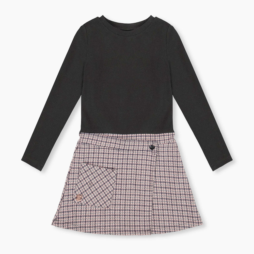 La robe bi-matière noir et pied-de-poule se distingue par son effet superposé et son style raffiné. Cette robe a un haut en côte brossée noire et une jupe portefeuille en tricot jacquard avec un grand motif pied-de-poule et une poche plaquée. Douce, extensible et confortable, elle convient aussi bien aux sorties festives qu’aux journées stylées.