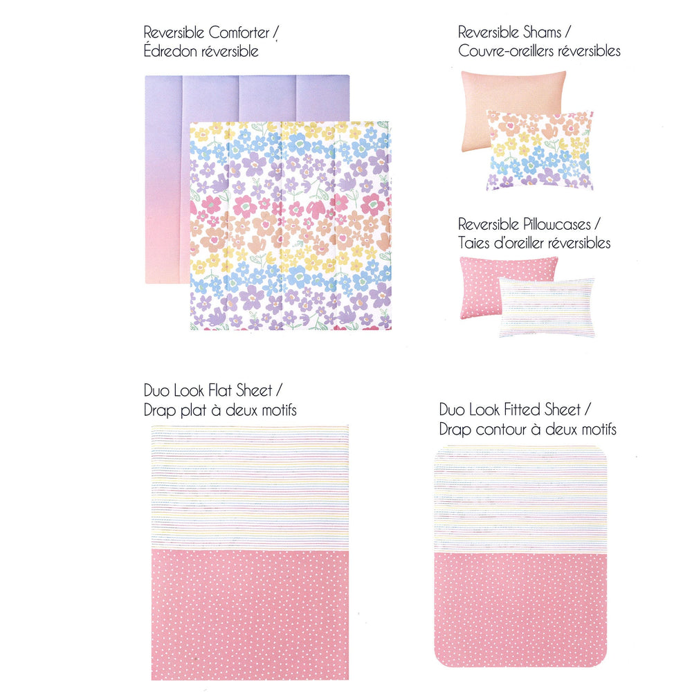 L'ensemble inclut: édredon réversible, 1 couvre-oreillers standard réversibles, 1 taies d'oreiller standard réversibles, 1 drap plat à deux motifs, 1 drap contour à deux motifs