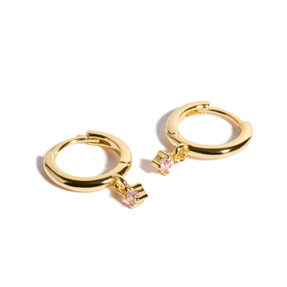 Les boucles d’oreilles Rosie sont des petits anneaux ornés d’une breloque en zircon rose. Ce bijou est fabriqué en or vermeil, composé en argent sterling 925 et plaqué or 14k, jaune.