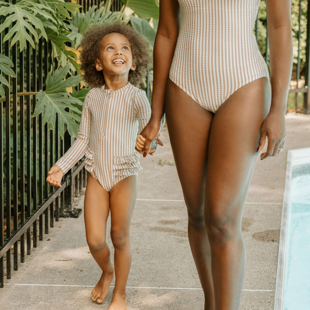 Conçu pour les journées en famille au bord de la mer, ce maillot de bain une-pièce en seersucker à rayures taupe s'agence parfaitement avec les modèles assortis pour toute la famille. Offrant un confort optimal à travers chaque éclat de rire et chaque éclaboussure, il assure une protection complète grâce à ses manches longues et à sa protection solaire intégrée UPF 50+. La fermeture éclair à l'avant rend l'habillage rapide et sans tracas; parfait pour les baignades improvisées et les aventures dans le sable.