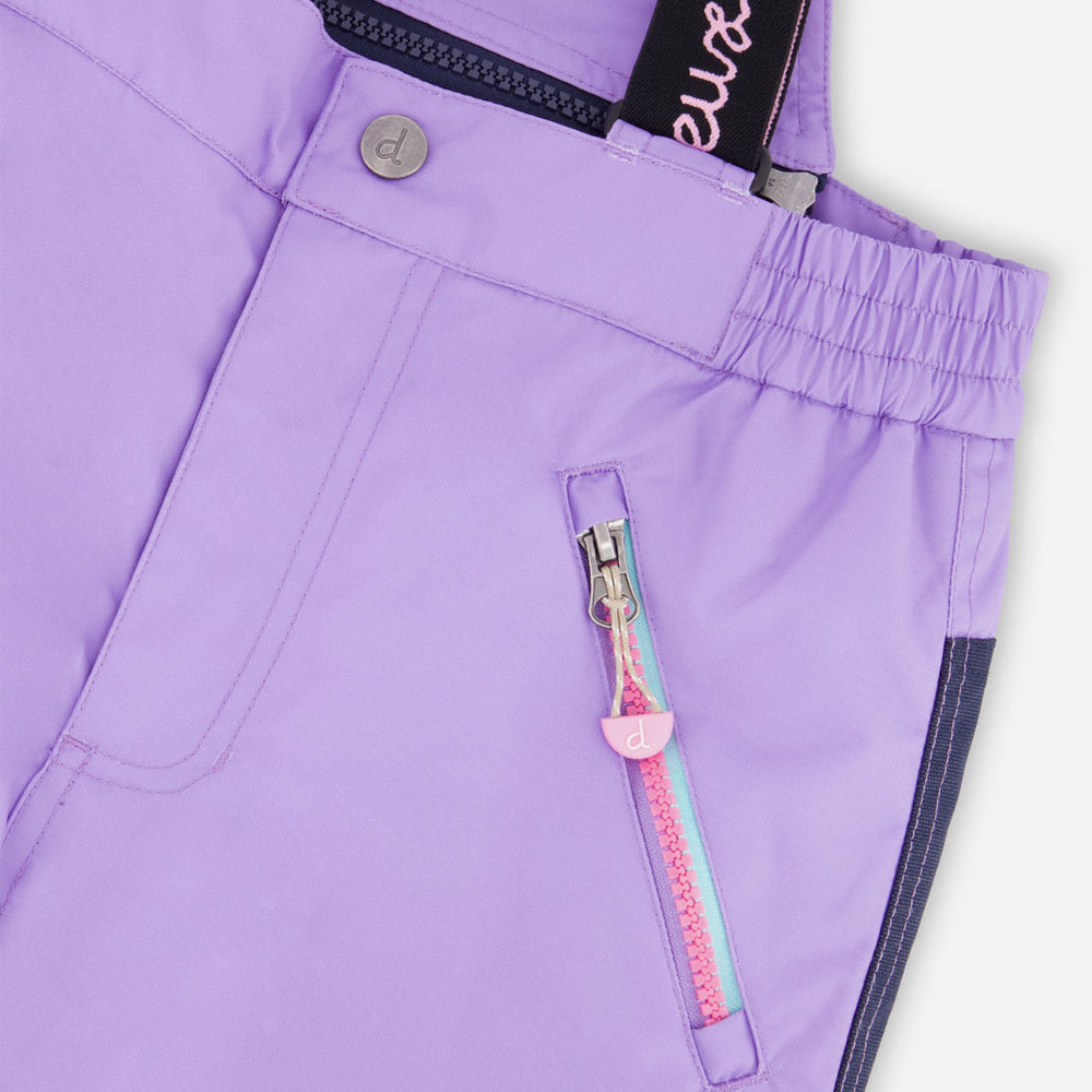 -Pantalon à taille élastique avec bretelles amovibles et ajustables. Comprend 2 poches à fermeture éclair sur chaque côté. Chevilles munies d’un pare-neige avec bande élastique caoutchoutée.