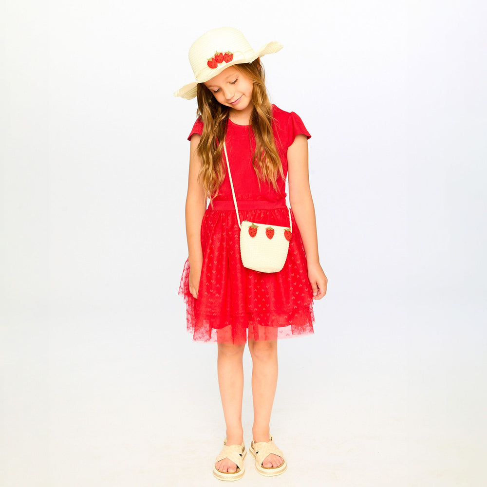 Charmant et pratique, notre chapeau de paille beige est la touche finale parfaite pour les journées ensoleillées. Confectionné en 100 % paille, cet accessoire chic est doté d’un large bord festonné pour plus d’ombre et de trois appliqués de fraises qui apportent une note douce et ludique. À porter avec le sac assorti de la collection "Explosion de marguerites" pour un ensemble estival ravissant.