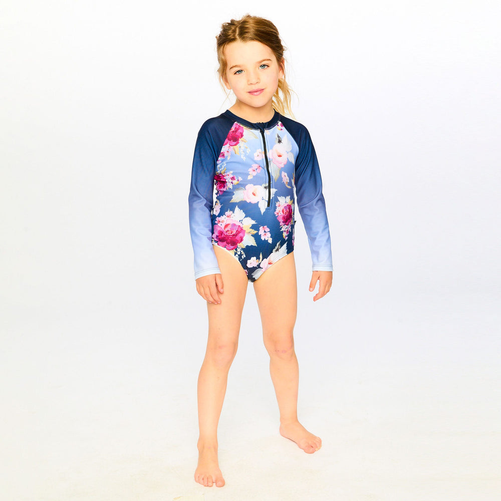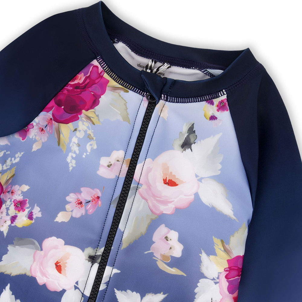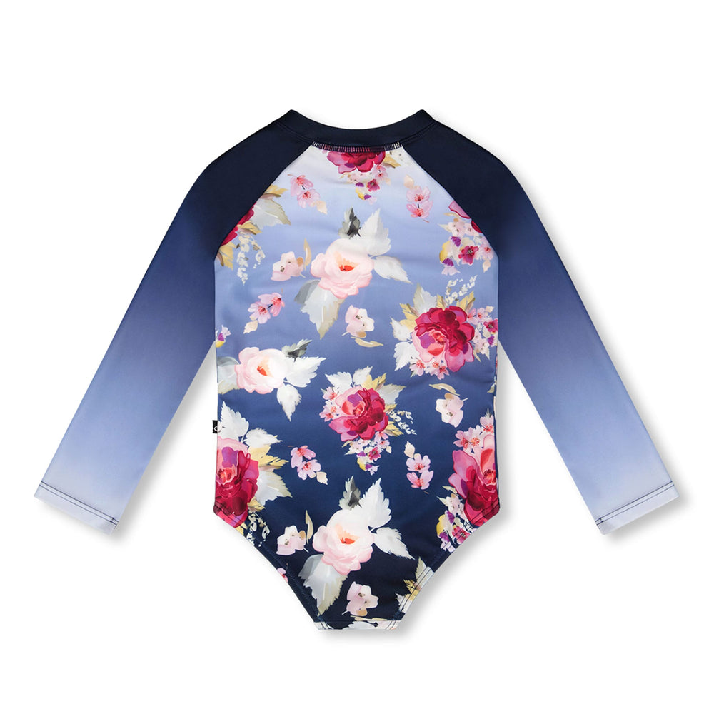 Le rashguard à manches longues une-pièce bleu à imprimé roses allie élégance et protection solaire. Ce maillot de bain arbore un imprimé romantique de roses sur le corps, complété par des manches longues dégradées et une fermeture éclair pratique à l’avant. Confectionné en polyester recyclé extensible, il offre confort et protection UPF, un choix idéal de notre collection "Comme un poisson dans l’eau".