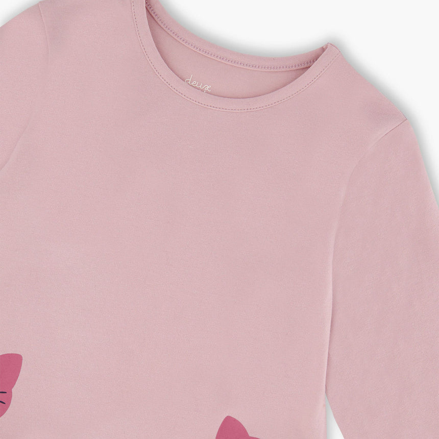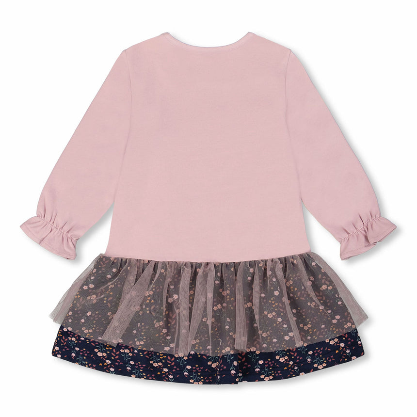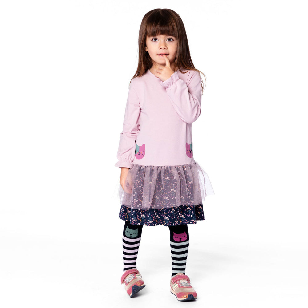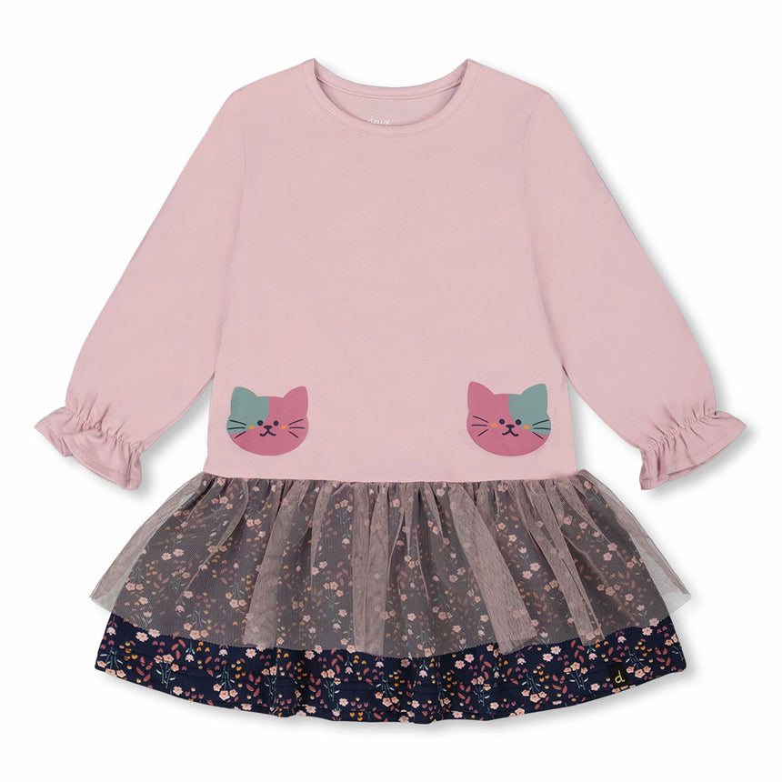 Cette robe bi-matière vieux rose est un mélange enchanté de coton biologique doux et d’une jupe fluide et pleine de vie. Cette robe charmante, avec son haut en interlock de coton biologique, s’ajuste confortablement, tandis que la jupe a une couche en tulle au-dessus d’un tissu jersey doux, créant un bel effet superposé. Le col rond, les deux adorables chats imprimés et les manches bouffantes ajoutent une touche de charme et de douceur. Avec sa coupe décontractée, cette robe est idéale pour des journées remplies d’imagination, de rires et d’aventures infinies.