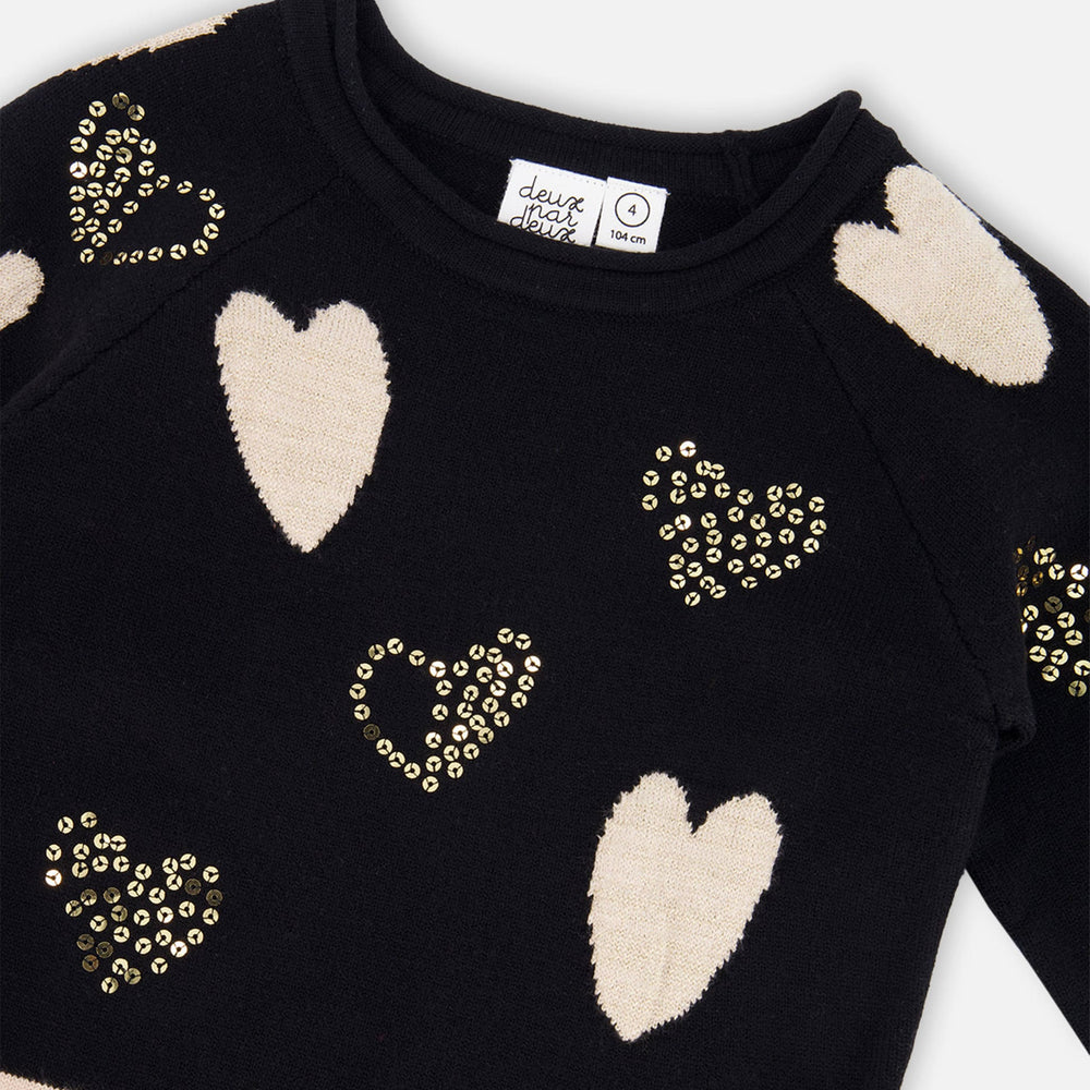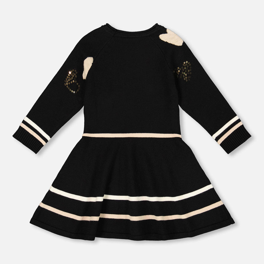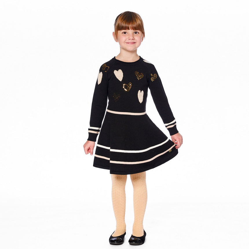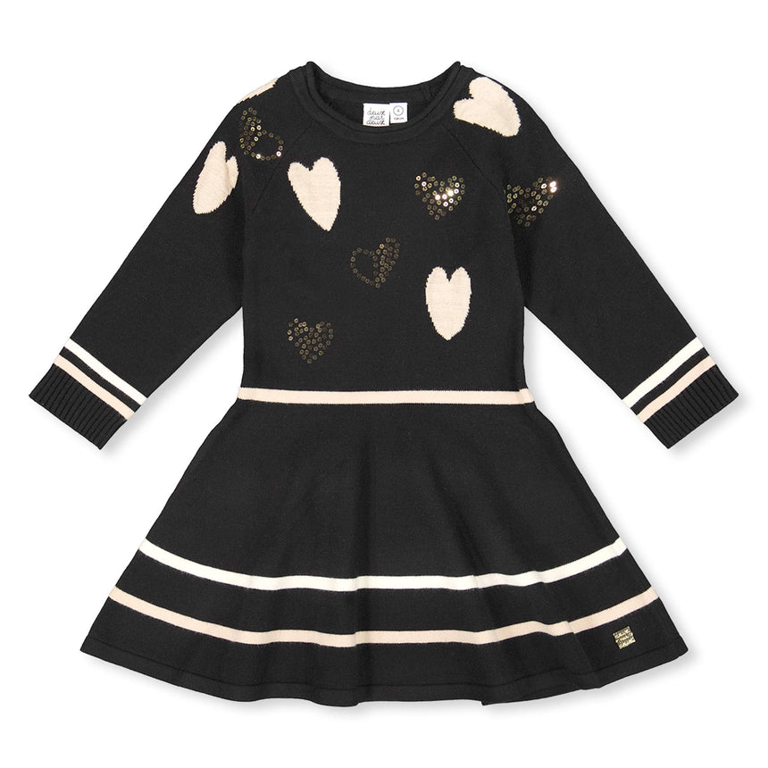 Notre robe en tricot noir avec motifs de cœurs scintillants apporte une touche lumineuse au quotidien comme aux occasions spéciales. Confectionnée dans un tricot doux, cette robe évasée a une taille basse, un col rond, des manches longues et des cœurs scintillants sur le haut et des bordures contrastantes au bas et aux poignets. Un modèle aussi confortable qu’élégant à porter toute la saison.