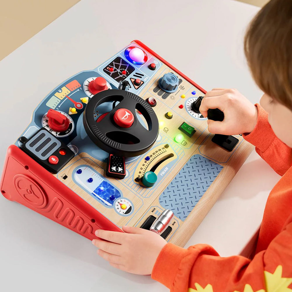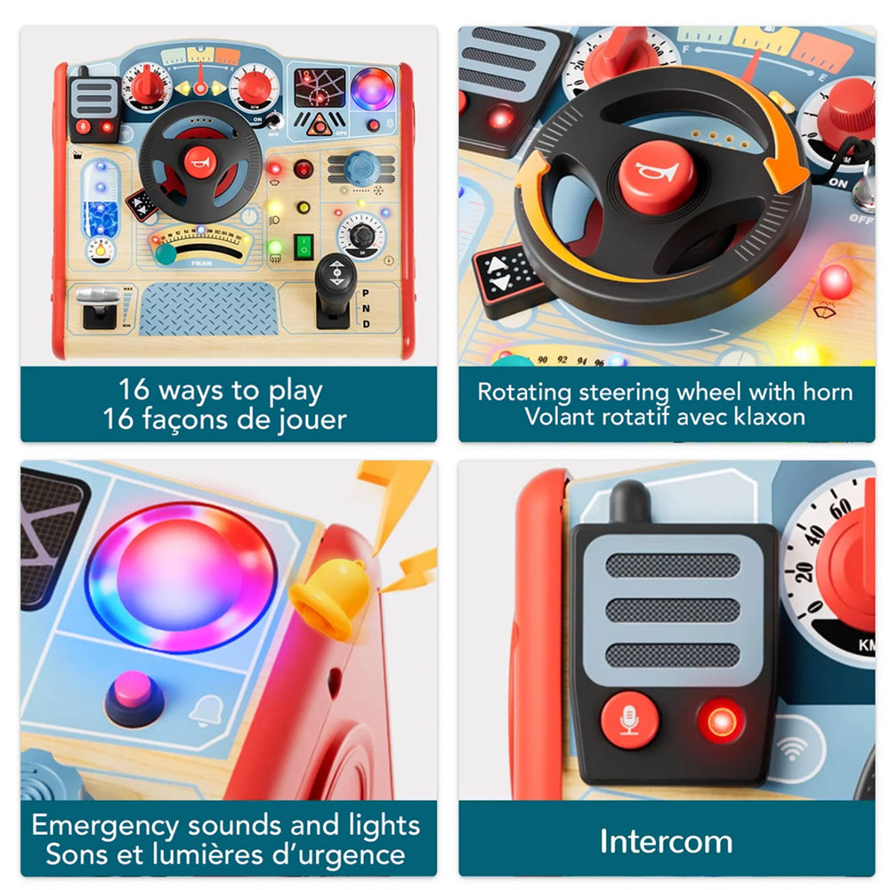 Ce tableau d'activités Montessori en bois sur le thème des pompiers propose 16 activités interactives conçues pour stimuler la motricité fine et l'imagination. Les enfants peuvent tourner le volant avec un klaxon réaliste, actionner les clignotants, changer les vitesses et même « démarrer » le camion avec une clé d'allumage. Avec son tableau de bord lumineux et ses curseurs de radio, ce jouet encourage la coordination œil-main et la résolution de problèmes à travers un jeu de rôle captivant. Fabriqué à partir d'un mélange durable de bois de haute qualité et d'ABS, il est parfait pour des heures de découverte créative, que ce soit à la maison ou en voyage.