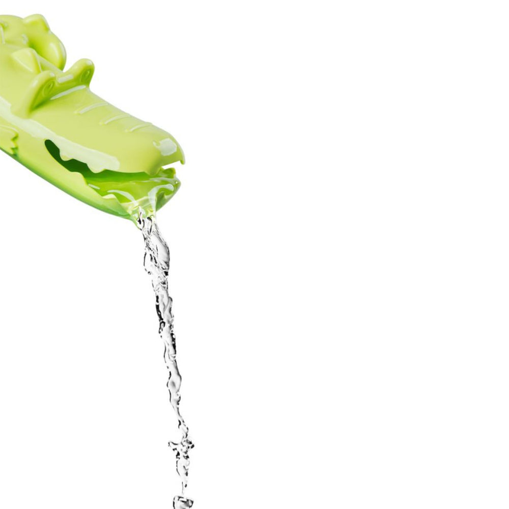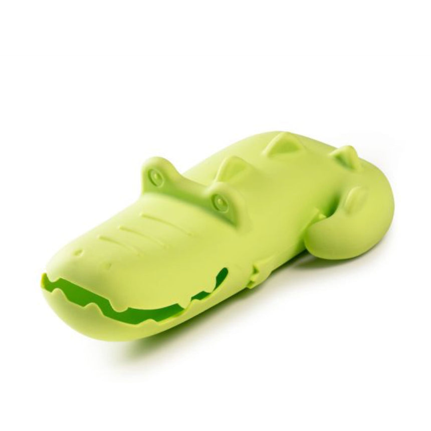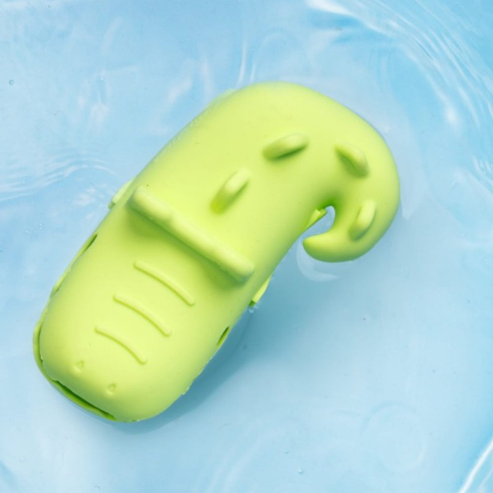 -Ce gentil crocodile fait de drôles de petites bulles lorsque tu le pousses sous l’eau.