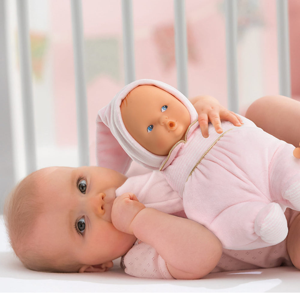 Le Babipouce Pays des Rêves a la peau blanche et les yeux bleus. Il est habillé d'un pyjama tout doux rose avec de jolis détails dorés. Il porte un bonnet rose, lui aussi tout doux. Grâce à sa petite taille (28 cm) et à sa légèreté, elle est facile à saisir et à transporter partout. La poupée est faite d'un tissu ultra-doux qui la rend très câline. Son doux visage réaliste en vinyle charme et réconforte bébé et est délicatement parfumé à la vanille, une signature Corolle. Un plus pour les parents : La poupée est dotée d'une étiquette cousue sur laquelle on peut écrire le prénom de bébé ou un numéro de téléphone au cas où la poupée serait perdue.