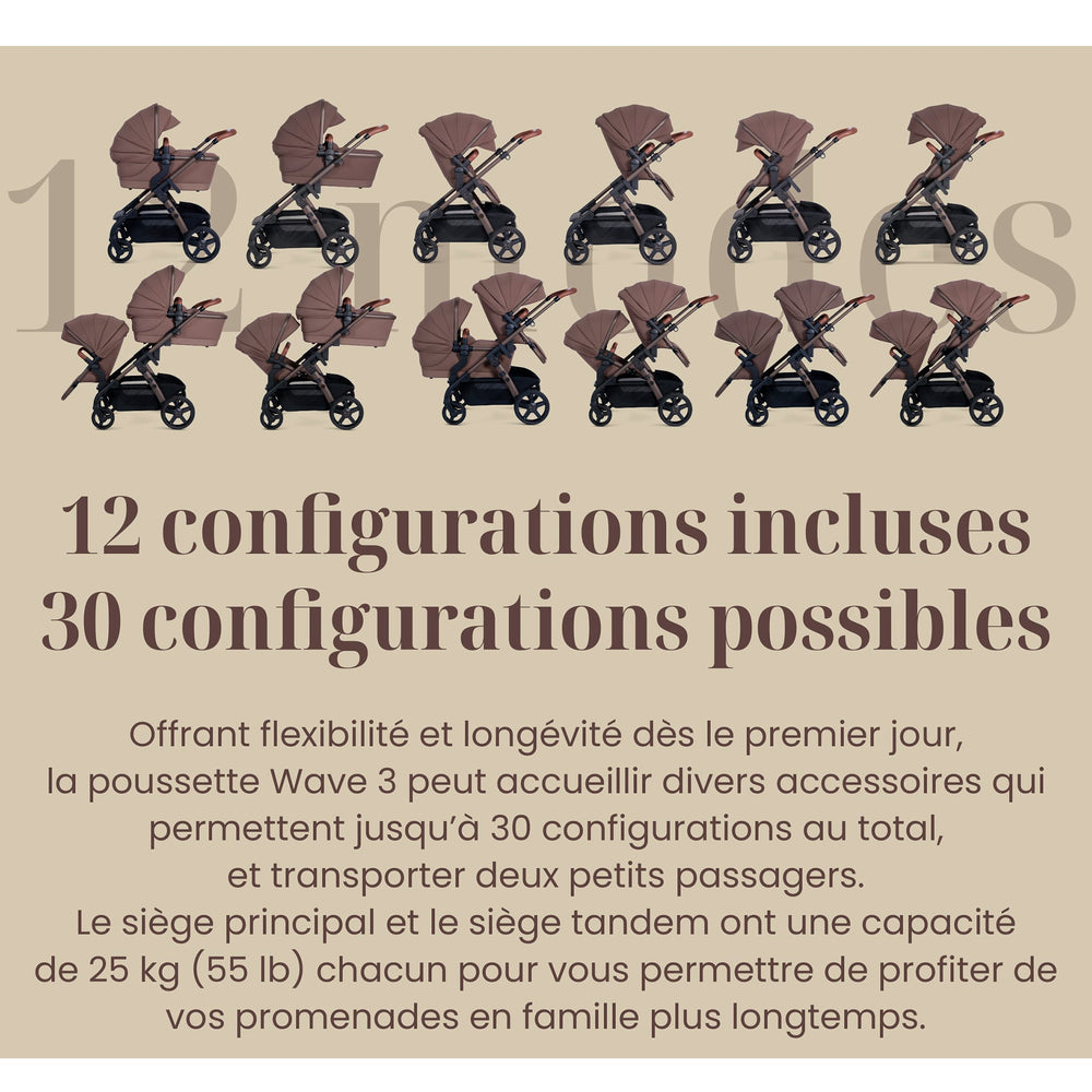 Conçue pour accompagner l’évolution de votre famille, la Wave 3 est une poussette simple et double qui s’adapte parfaitement à vos besoins. Grâce à son système ingénieux, elle permet jusqu’à 12 configurations dès la sortie de la boîte et peut être complétée par des accessoires pour atteindre 30 modes d’utilisation. Avec son design raffiné et ses finitions soignées, la Wave 3 offre flexibilité et confort, garantissant des promenades agréables en solo ou avec plusieurs enfants. Une poussette pensée pour aujourd’hui et demain !