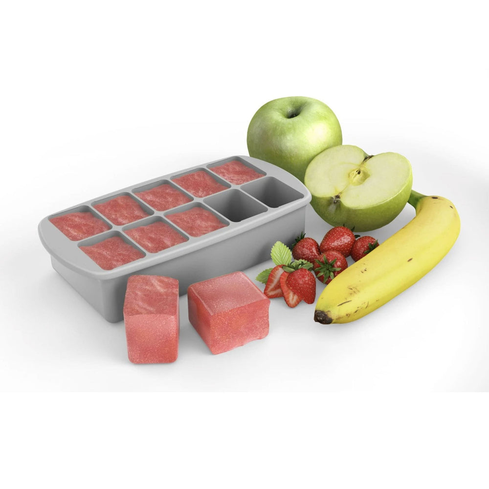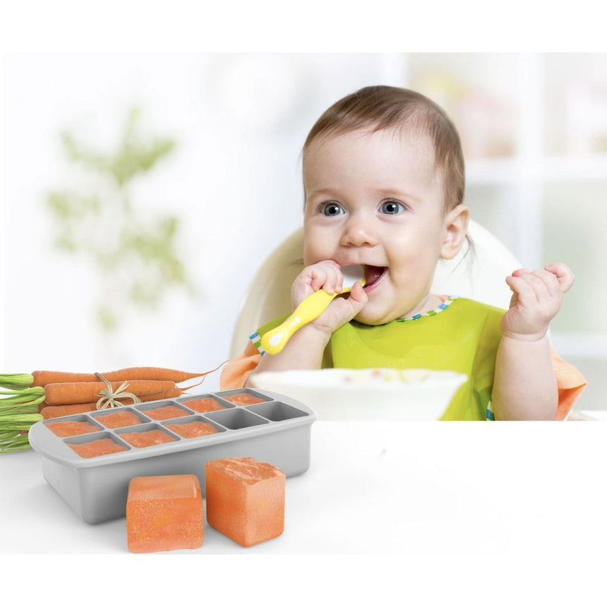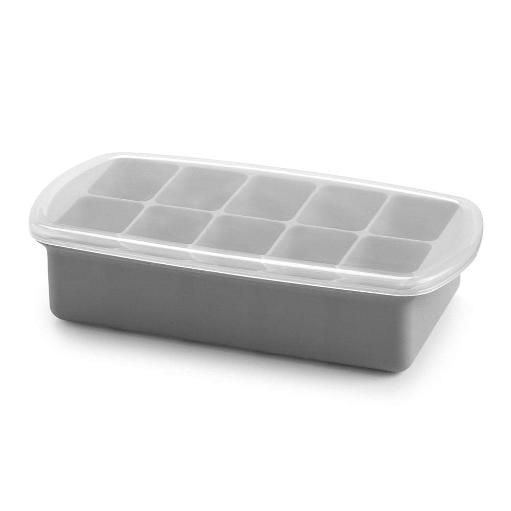 Congelez des portions d'aliments pour bébé faits maison dans le plateau de congélation en silicone. Le silicone souple vous permet de sortir facilement les aliments congelés pour bébé. Le couvercle en plastique transparent empêche les déversements et protège les aliments des odeurs. Peut également être utilisé comme bac à glaçons ordinaire lorsque la phase de purée des aliments pour bébés est terminée.