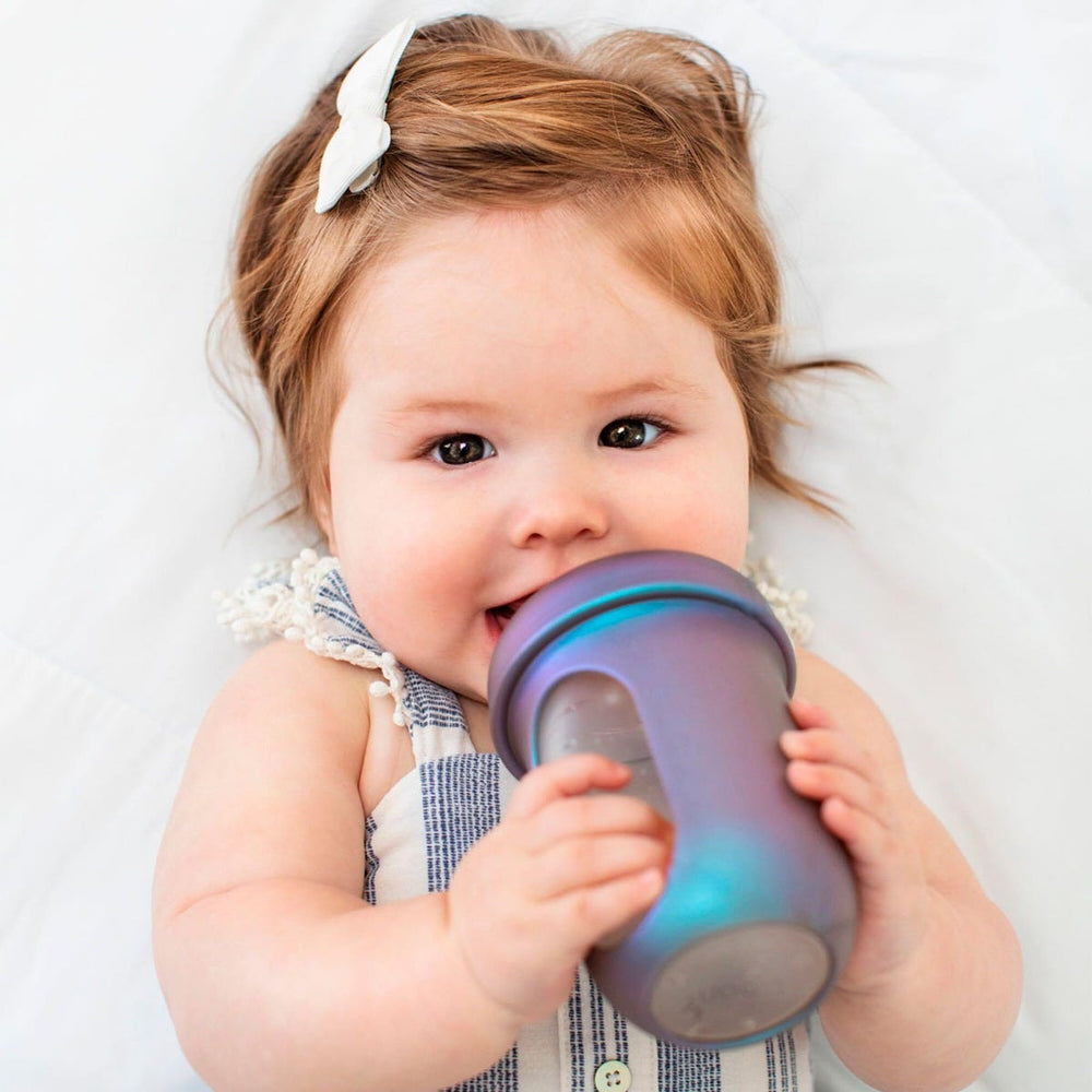 Le biberon en silicone NURSH de Boon présente un design innovant qui s'écrase pendant que votre bébé boit, expulsant l'air gazeux qui provoque des coliques. Le silicone facile à nettoyer peut même être bouilli, stérilisé, passé au micro-ondes et congelé.