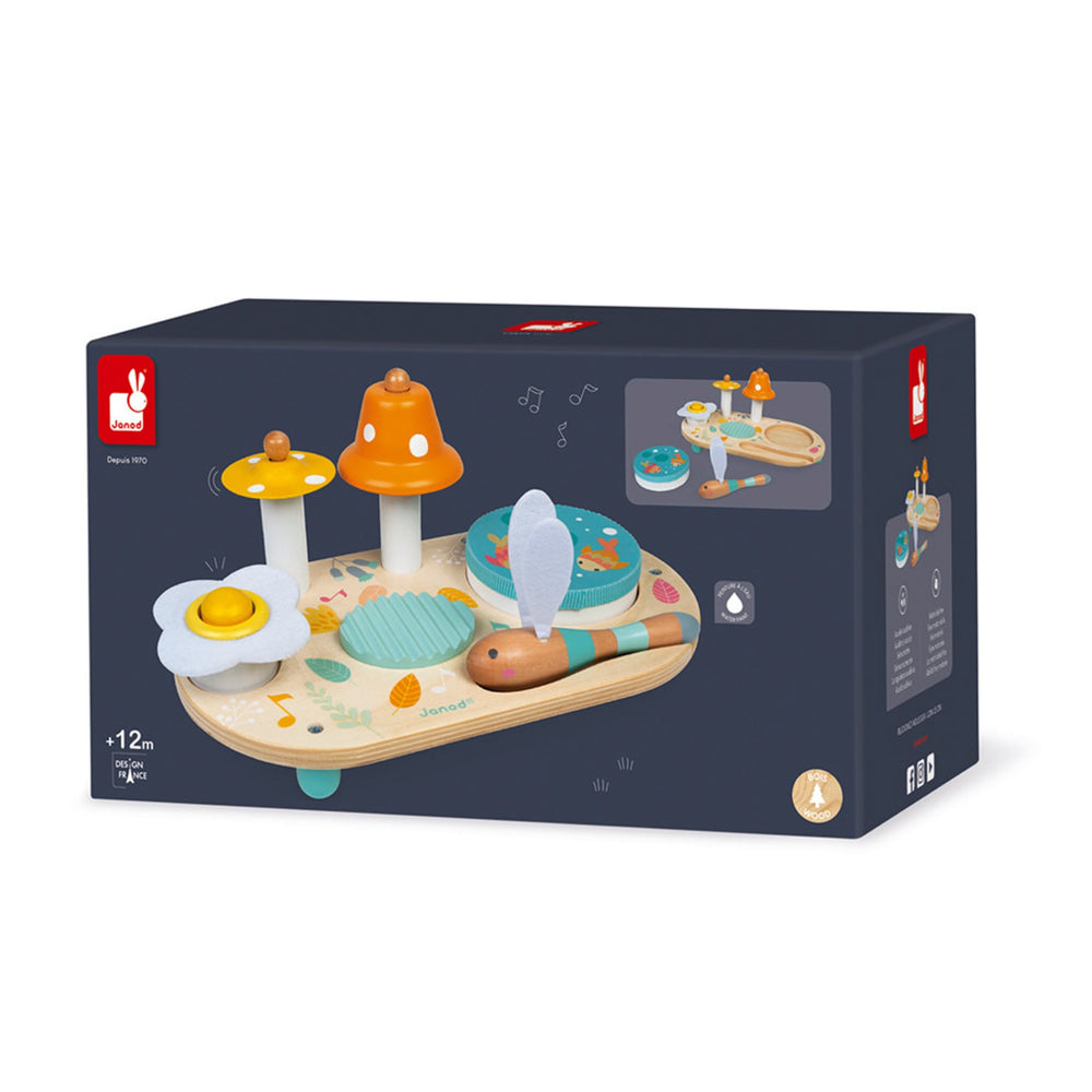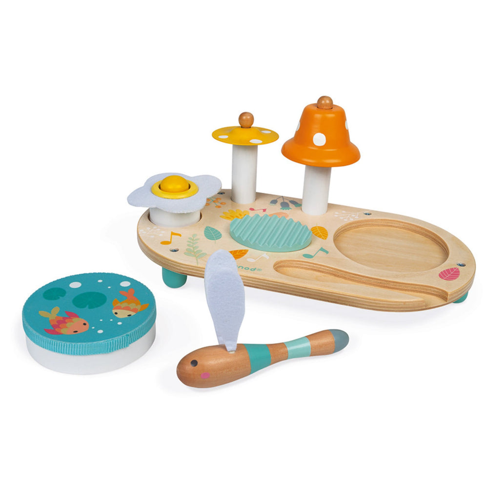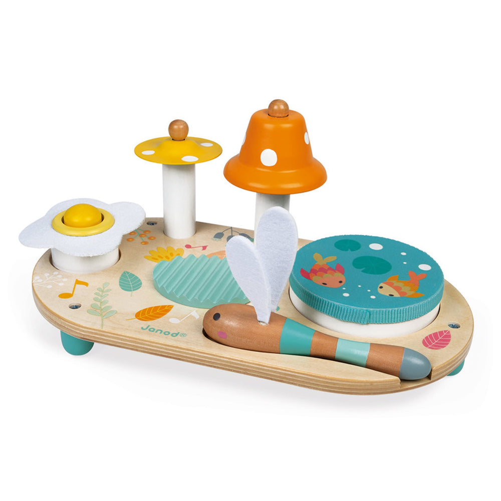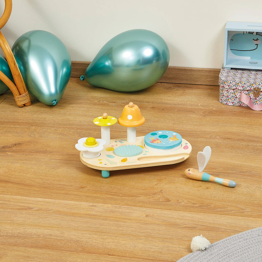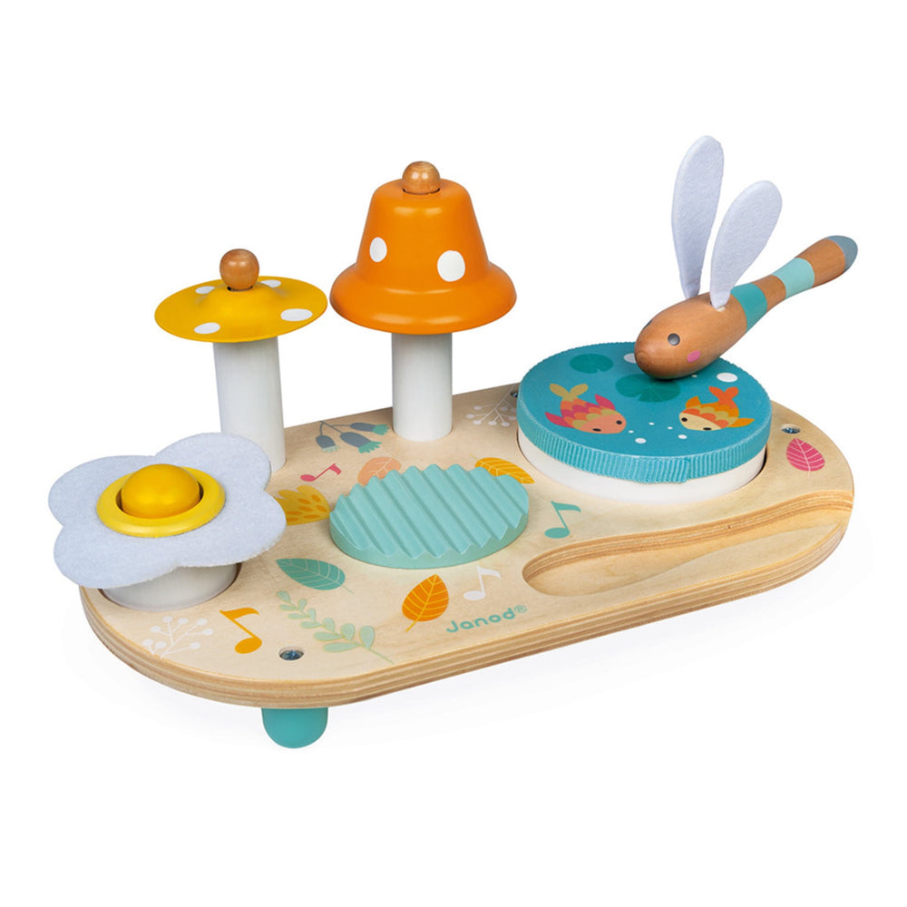 Bienvenue en pleine nature, pour une balade bucolique entre libellules et fleurs champêtres ! Au programme du voyage de bébé, la découverte musicale avec cette jolie table Pure aux couleurs et aux illustrations douces et romantiques ! A partir de 1 an, les enfants vont pouvoir appréhender les différents sons en toute autonomie grâce à ce beau jeu d'éveil sonore. La table musicale se compose d'une cymbale champignon jaune, d'une cloche orange à pois blanc, d'un grattoir en bois, d'un pouet-pouet aux airs de marguerite et d'un tambourin amovible. Ce dernier représente une belle mare où les poissons font des bulles sous les nénuphars. Pour faire retentir l'ensemble, les enfants pourront se servir de cette baguette rigolote en forme de libellule avec ses ailes toutes douces en feutrine blanche ! Avec ce jouet premier âge en bois, bébé va se familiariser avec la musique à son rythme !