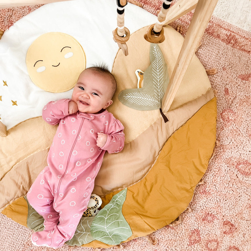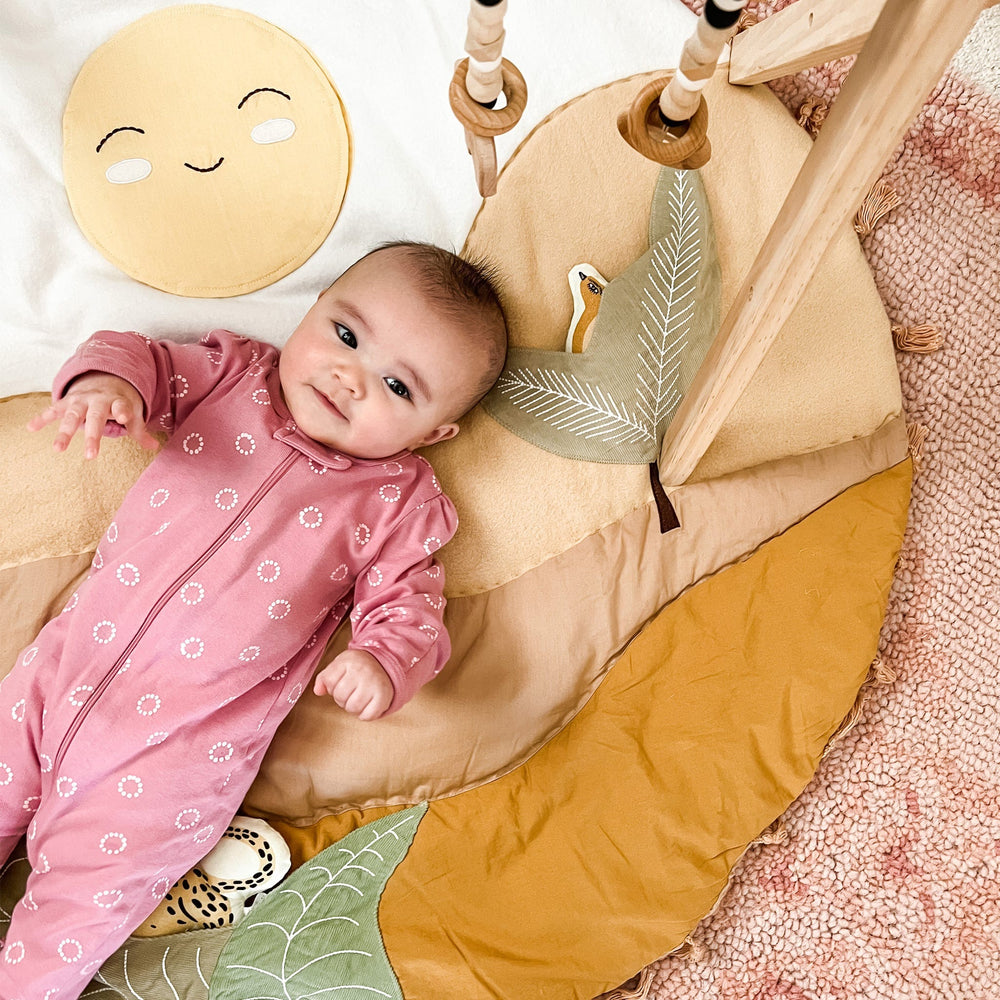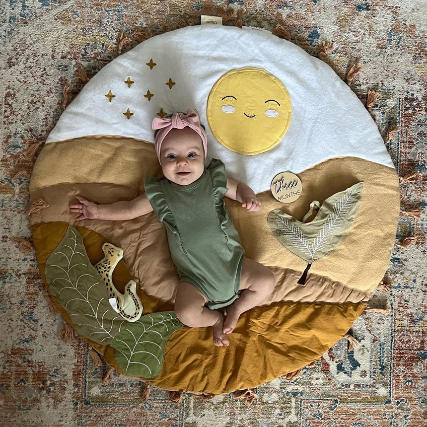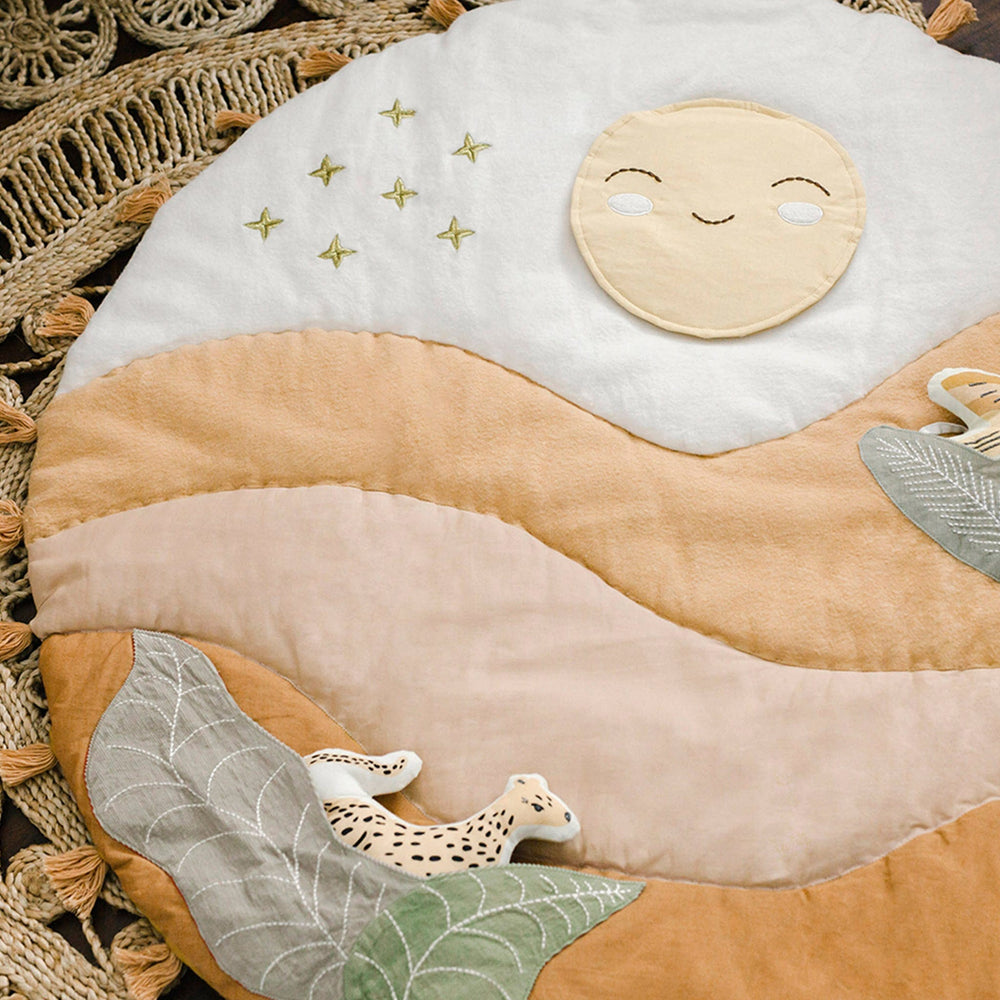Du lever au coucher du soleil, le tapis d’activité Desert Sunset est l’endroit idéal où passer des moments de détente, jouer et tisser des liens avec votre bébé. Ce tapis comprend plusieurs éléments interactifs qui encourage le développement, comme un miroir qui émet un bruit de papier froissé, un hochet léopard en peluche et un oiseau qui produit un petit cri quand bébé lui presse le ventre. Ce joli tapis de jeu est lavable à la machine et s’agence avec plusieurs de nos ensembles de literie pour bébé (vendus séparément) pour vous permettre de créer un décor en parfaite harmonie.