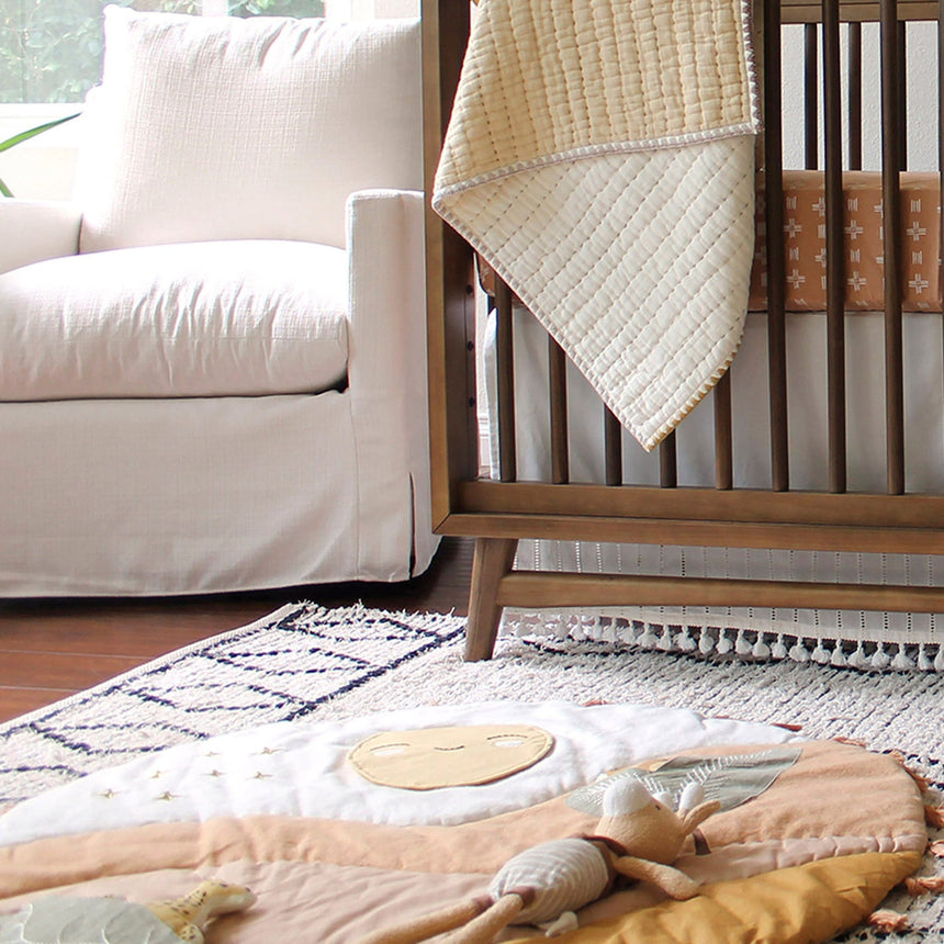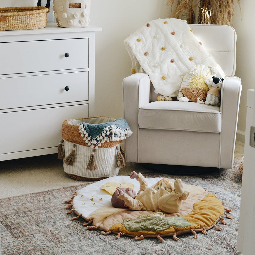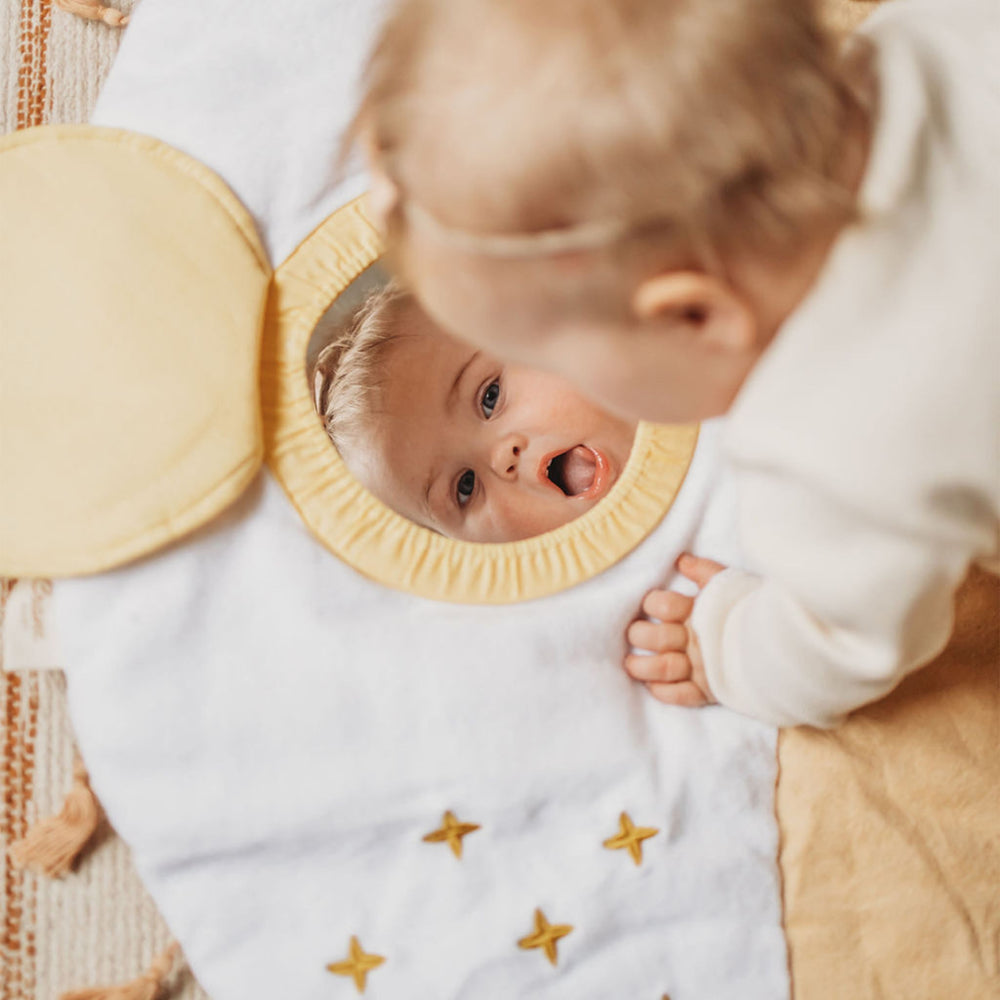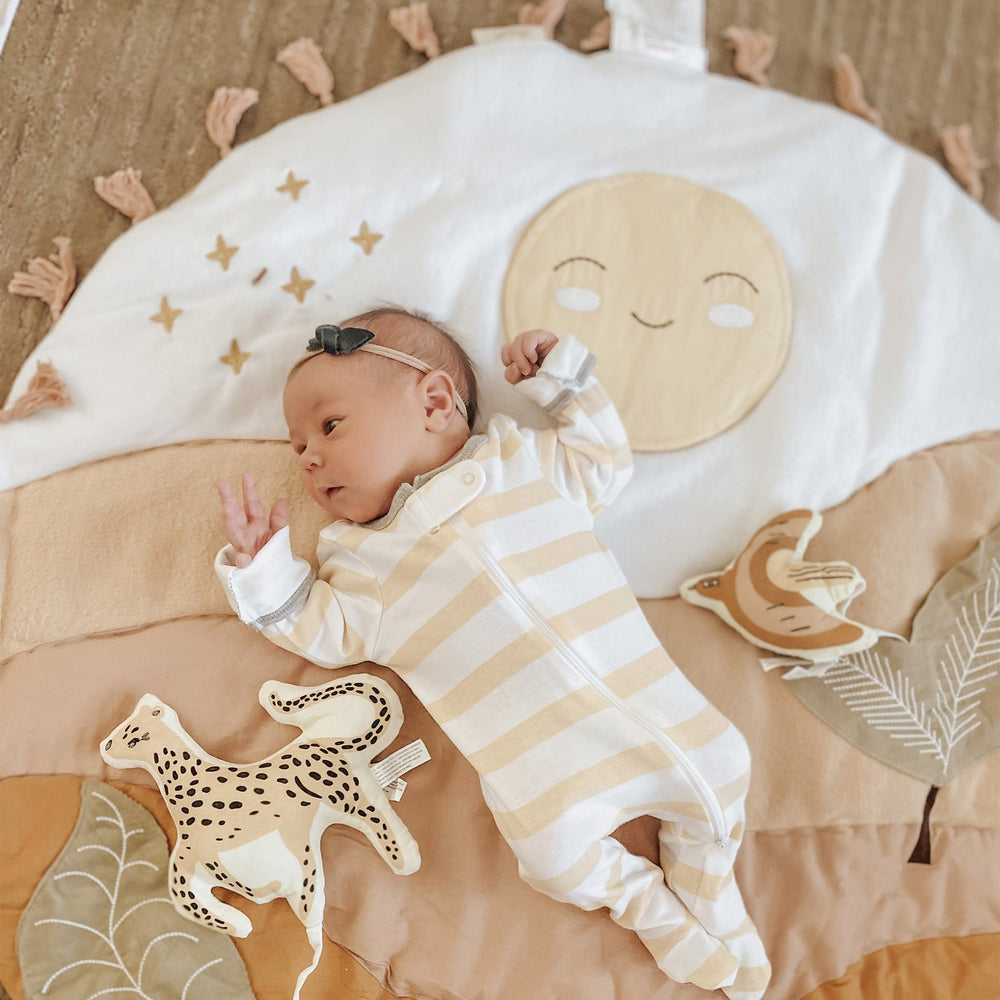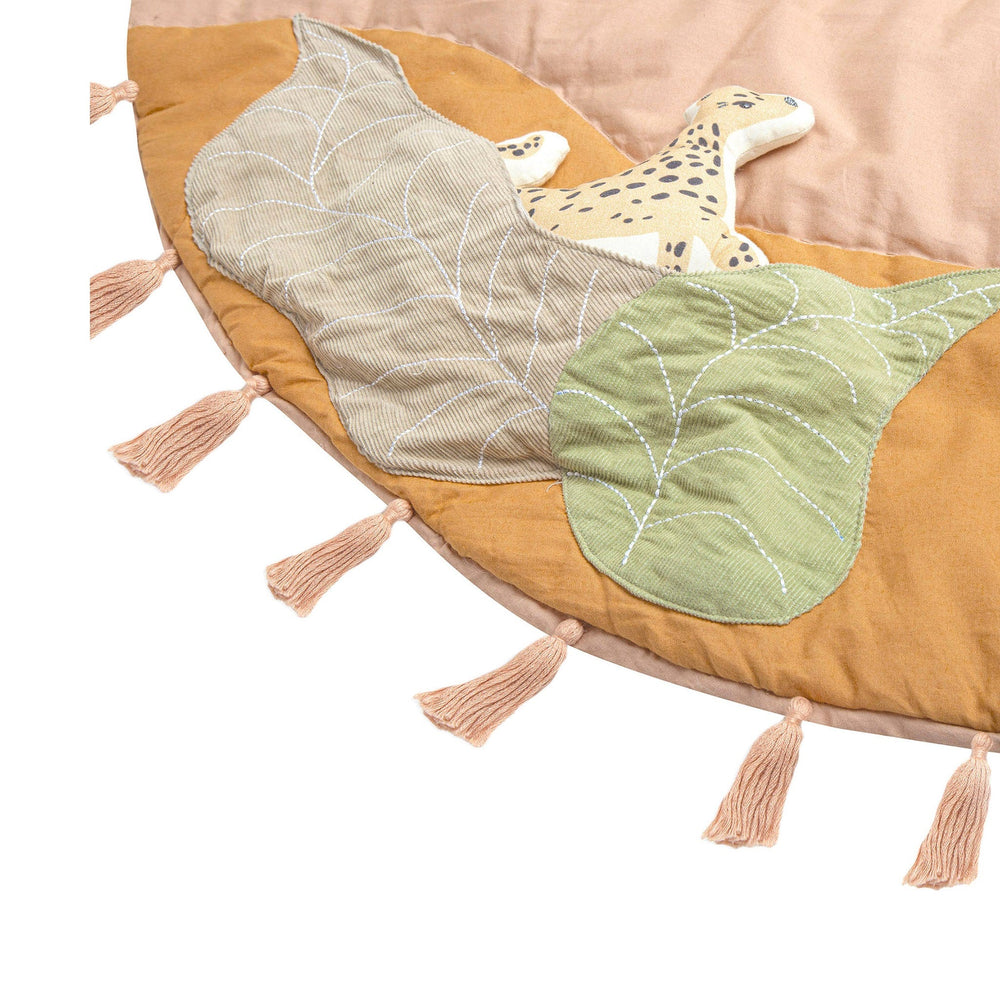 Du lever au coucher du soleil, le tapis d’activité Desert Sunset est l’endroit idéal où passer des moments de détente, jouer et tisser des liens avec votre bébé. Ce tapis comprend plusieurs éléments interactifs qui encourage le développement, comme un miroir qui émet un bruit de papier froissé, un hochet léopard en peluche et un oiseau qui produit un petit cri quand bébé lui presse le ventre. Ce joli tapis de jeu est lavable à la machine et s’agence avec plusieurs de nos ensembles de literie pour bébé (vendus séparément) pour vous permettre de créer un décor en parfaite harmonie.