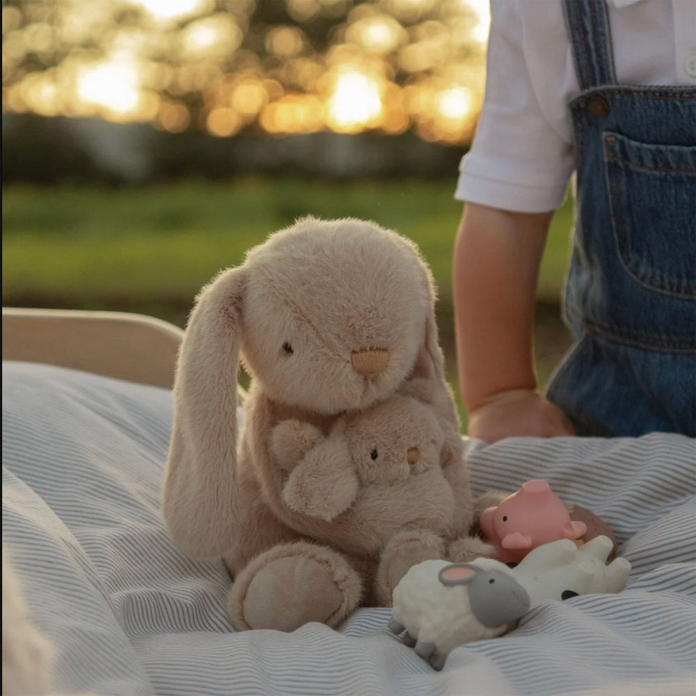 Douce et attachante, cette maman lapin câline tient son bébé lapin tout contre elle. Ce duo de peluche amusera votre enfant aussi bien ensemble que séparément!