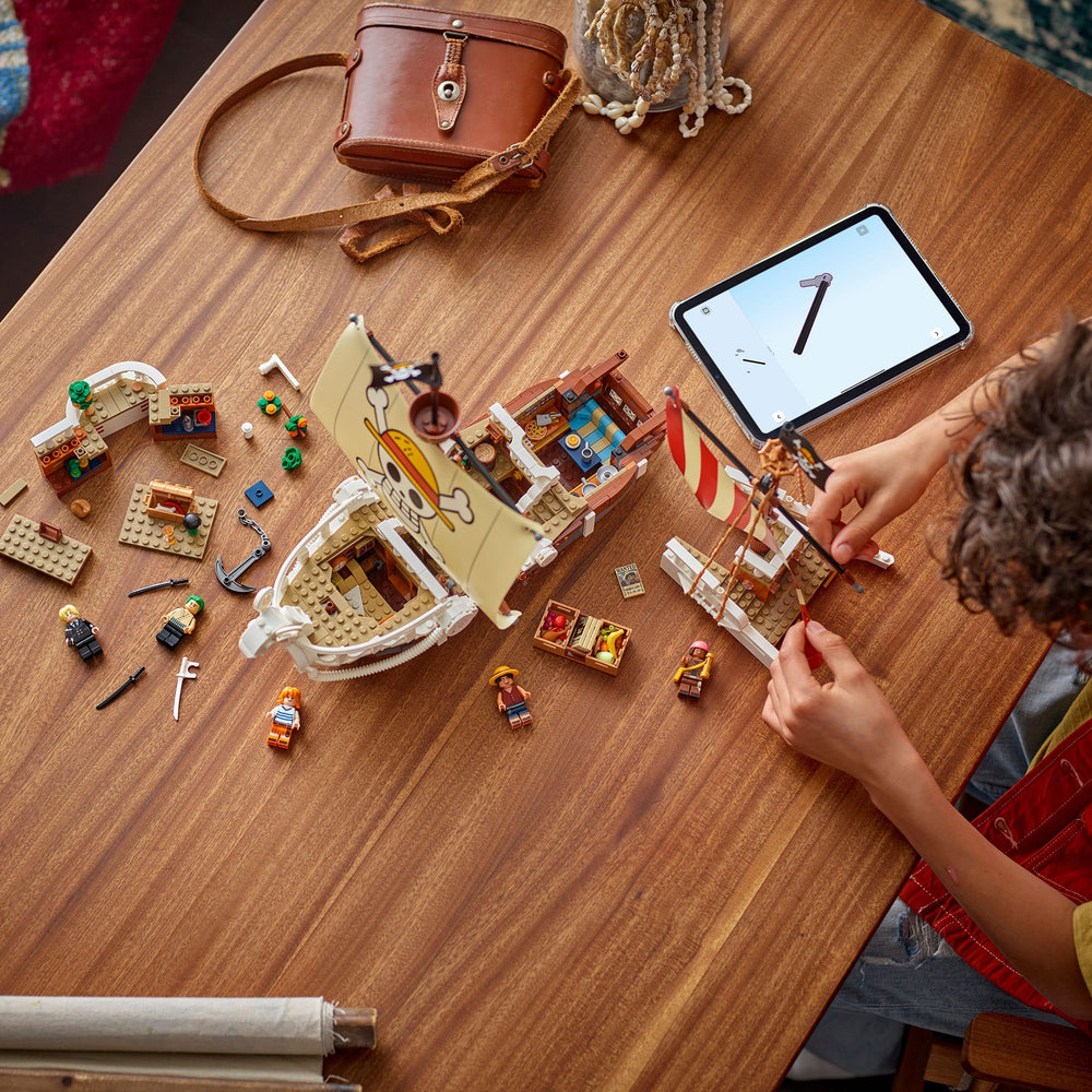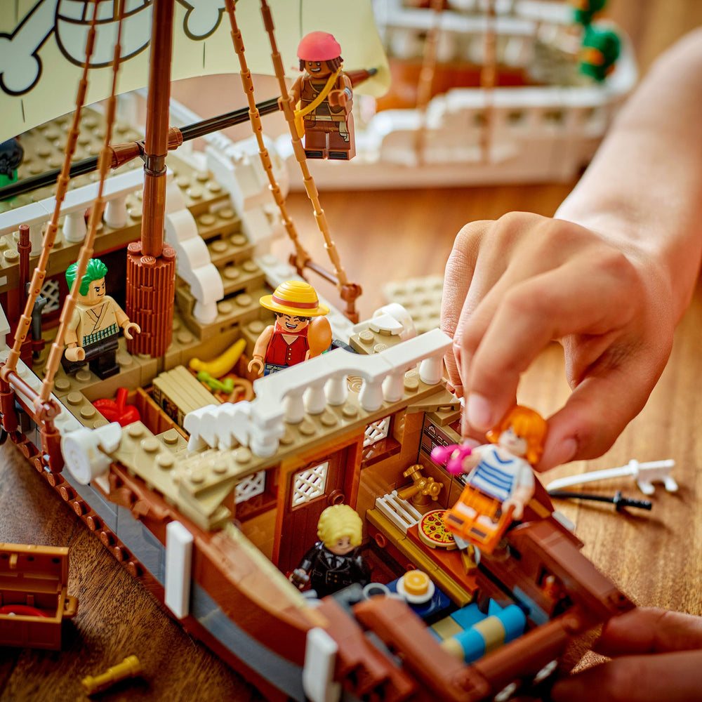 Le navire emblématique comporte plusieurs espaces intérieurs : une cabine d’équipage, une cuisine, un espace de rangement et un atelier d’accessoires. Le modèle est livré avec cinq figurines LEGO ONE PIECE. Luffy est assis sur la figure de proue en forme de mouton à l’avant du navire, sous laquelle se trouve un canon ; Zoro se détend et s’entraîne sur le pont ; Nami contrôle le gouvernail à l’arrière, où ses mandariniers préférés poussent sur le pont ; Usopp grimpe aux mâts et monte la garde depuis le nid-de-pie ; et Sanji descend les casseroles dans la cuisine. Comprend quatre affiches « Wanted ». L’application LEGO Builder permet aux enfants d’agrandir, de faire pivoter les modèles en 3D et de suivre leur progression. L’ensemble contient 1 376 pièces.