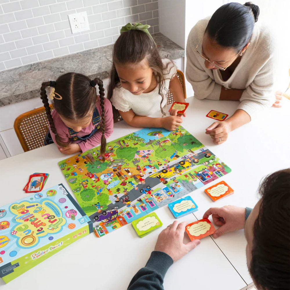Trouve un animal blanc! Trouve un objet bleu qui sert à s'assoir! Trouve un aliment jaune qui n'est pas un fruit! Écoute bien les consignes et sois le plus rapide à trouver les éléments sur la planche de jeu.