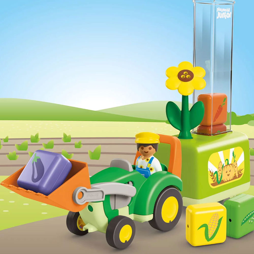 Contient : Un personnage : 1 homme - Des accessoires : 1 tracteur avec planteuse, 5 éléments de triage, 1 fleur enfichable