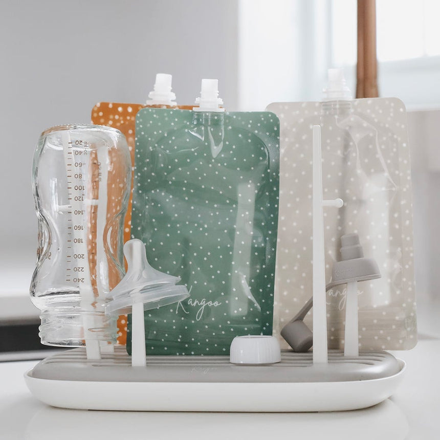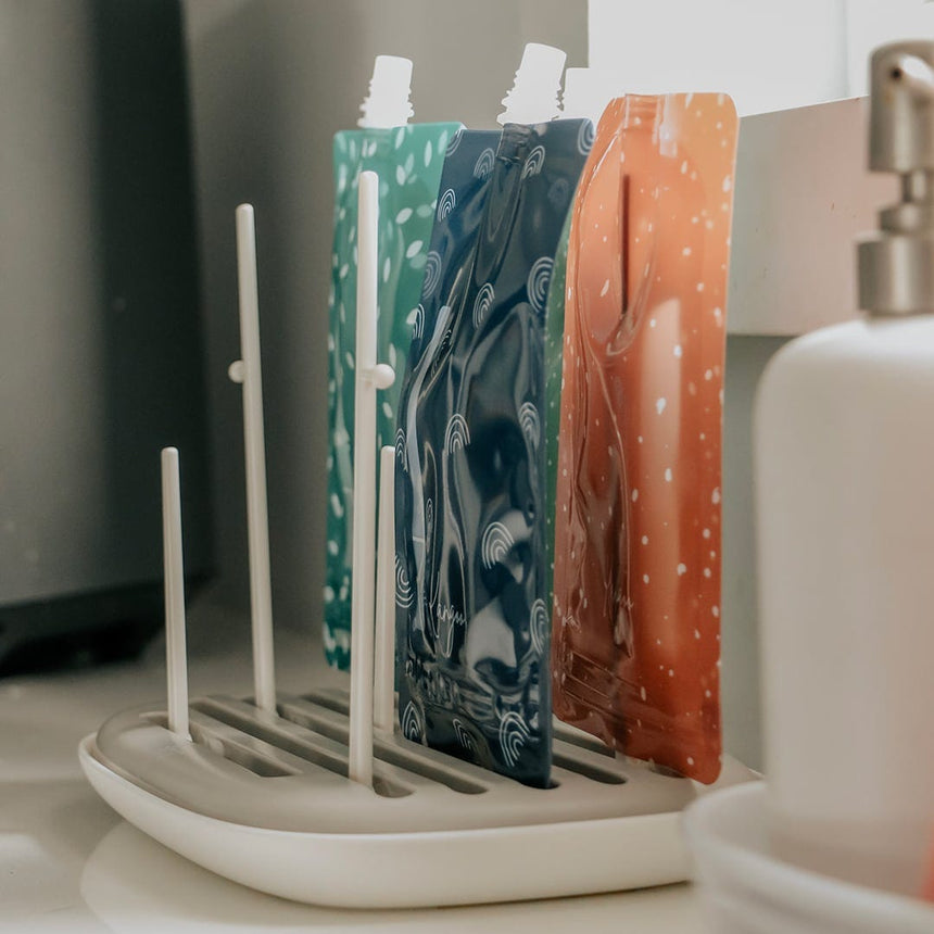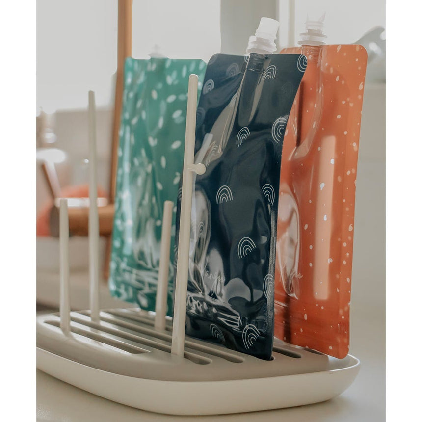 Notre joli égouttoir de couleur greige sans BPA est idéal pour faire sécher vos pochettes alimentaires réutilisables, vos biberons, tétines pour biberon, bouteilles et autres accessoires.