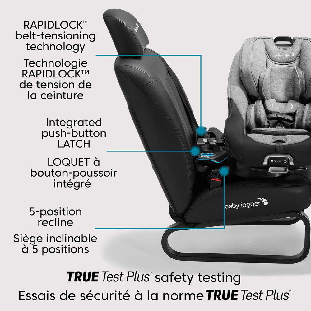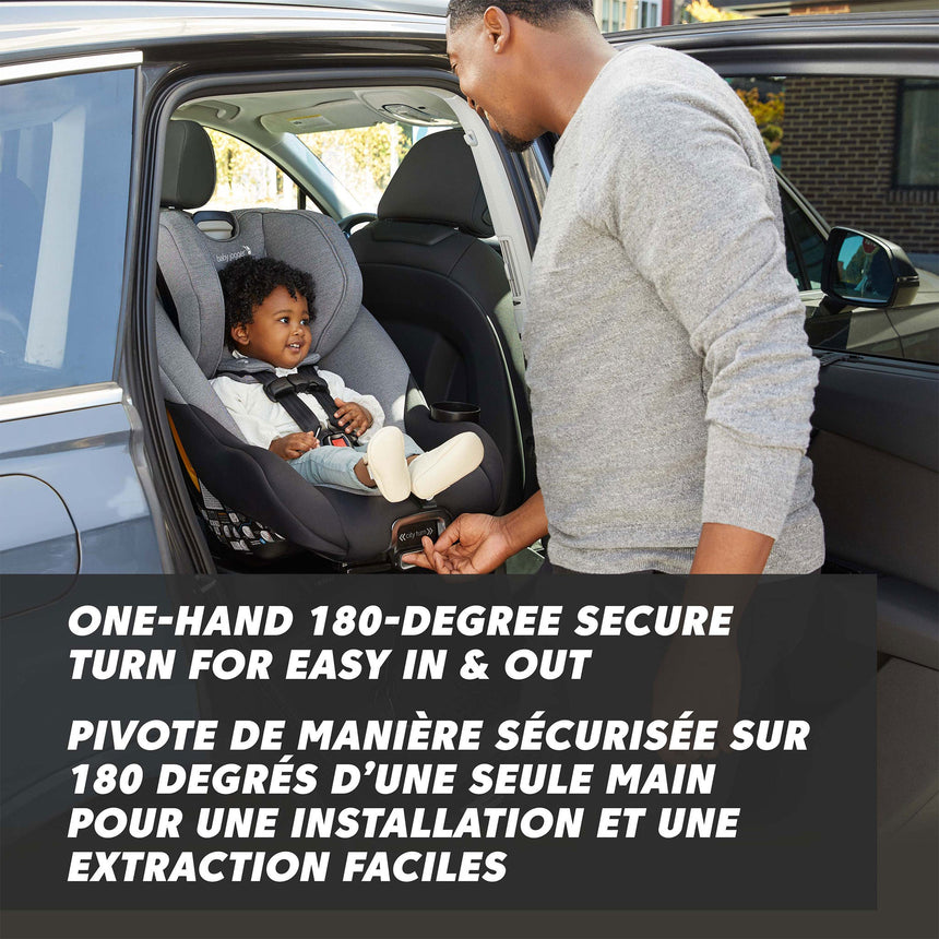 Le siège d'auto convertible Baby Jogger® City Turn™ est doté d'un mécanisme de rotation sécurisé qui vous permet de tourner le siège à 180 degrés d'une seule main en mode dos à la route. La rotation brevetée unique rapproche votre enfant de 10 pouces de vous et vous aide à maintenir une posture plus droite lorsque vous soulevez et retirez votre enfant et que vous l'attachez dans le siège d'auto. Le siège tourne doucement d'une seule main, puis s'enclenche de manière audible pour garantir qu'il est bien fixé.