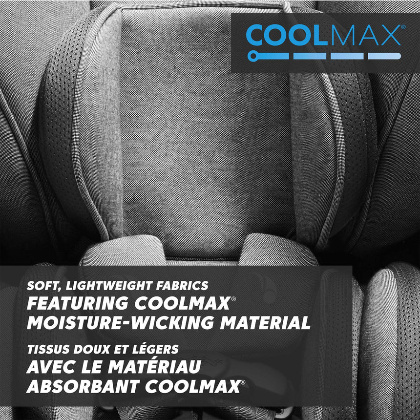 Le siège d'auto se transforme d'un harnais orienté vers l'arrière (4 à 40 lb) en un harnais orienté vers l'avant (22 à 65 lb) pour grandir avec votre enfant. Les tissus doux et légers dotés du matériau COOLMAX® qui évacue l'humidité aideront à garder votre enfant au frais et à l'aise. Comme votre tenue d'entraînement préférée, elle est rafraîchissante et résistante au froissement et à la décoloration au fil du temps. La technologie de tension de courroie RAPIDLOCK™ intégrée et le bouton-poussoir LATCH permettent une installation simple et sécurisée en quelques secondes. Un appui-tête à 10 positions et une inclinaison à 5 positions assurent une conduite confortable, et le harnais sans réenfilage signifie que vous pouvez ajuster le harnais sans le retirer. Ce siège a été testé selon les normes de sécurité TRUE Test Plus™, conçues pour aider à protéger votre enfant en cas de retournement, de collision latérale, avant et arrière.
