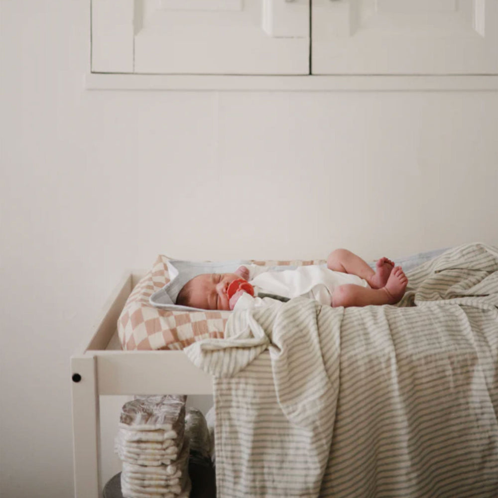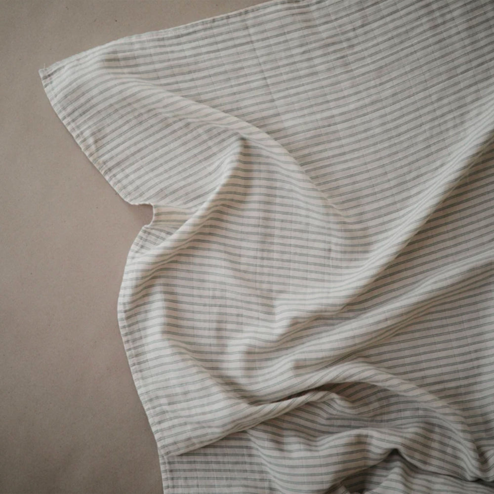 Le moment de la sieste devient encore plus douillet avec le lange en mousseline Mushie – idéal pour emmailloter, allaiter et câliner votre bébé.