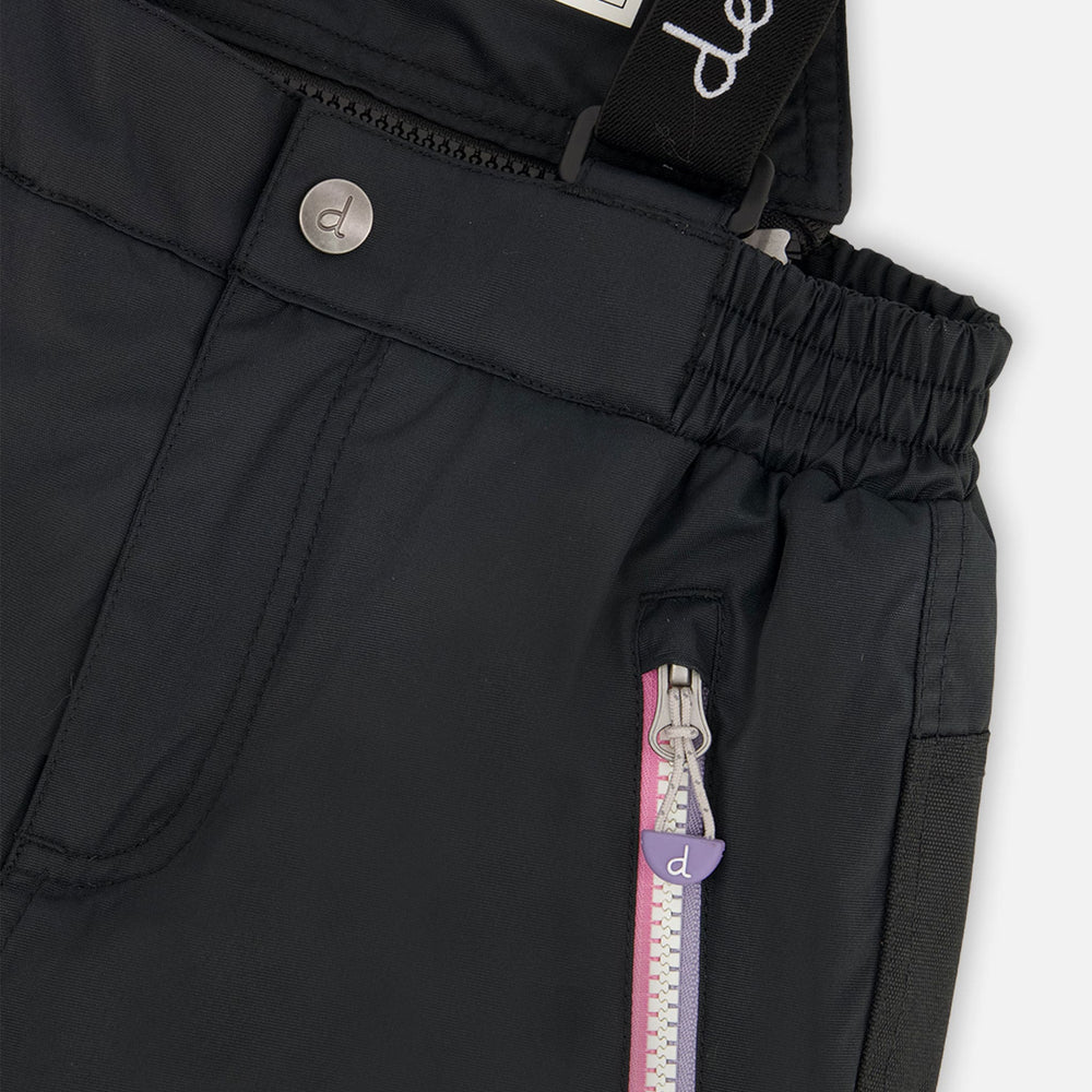 -Pantalon à taille élastique avec bretelles amovibles et ajustables. Comprend 2 poches à fermeture éclair sur chaque côté. Chevilles munies d’un pare-neige avec bande élastique caoutchoutée.