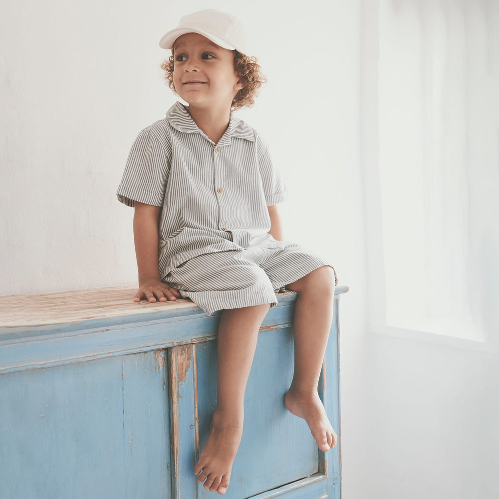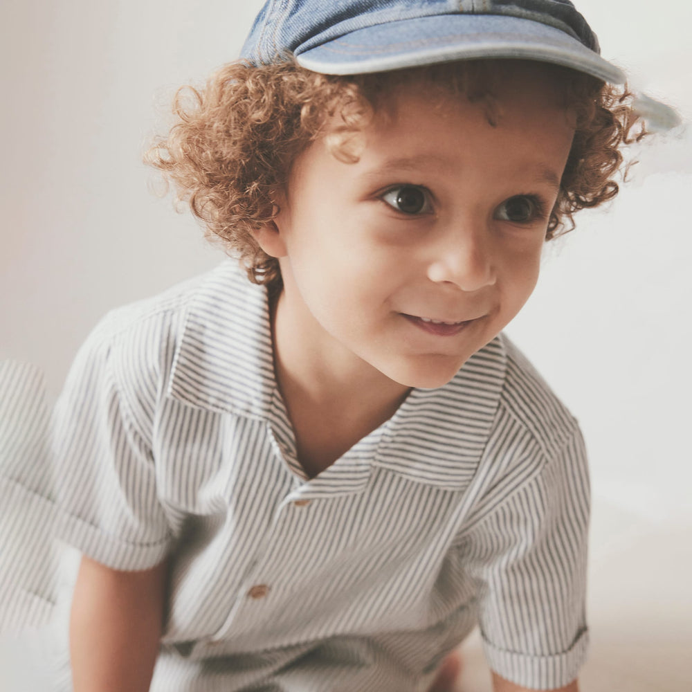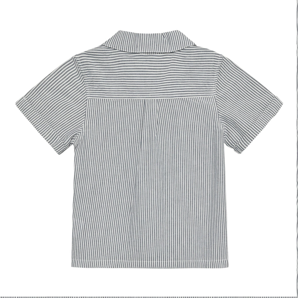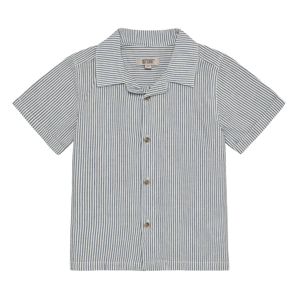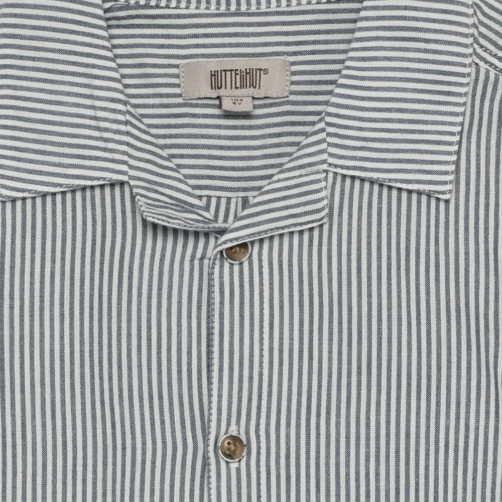 Chemise rayée HUTTEliHUT à manches courtes. Col classique, revers discret aux manches et boutons continus. Certifiée GOTS - coton biologique CERES-0366.