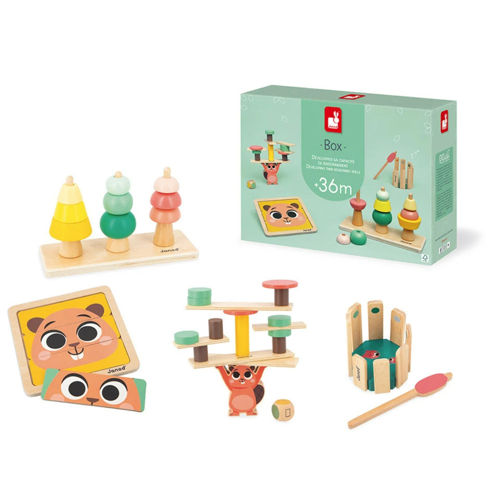 Une box de jouets pensée pour bébé dès 36 mois : voilà la Janod Box ! Pensée spécialement pour encourager la réflexion, cette box enfant contient 4 jeux éducatifs en bois.