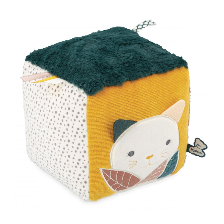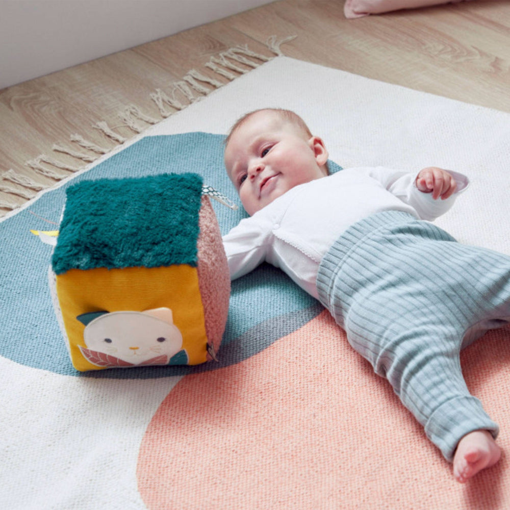 Conçu et produit en collaboration avec des psychomotriciens, ce cube sensoriel de 6,63 pouces est une excellente manière amusante de stimuler doucement les sens de bébé. Ce cube sensoriel doux et câlin peut être facilement saisi et manipulé. Ses nombreuses faces avec différents matériaux, textures et couleurs aident particulièrement à développer le sens du toucher de bébé. L'ajout de la pièce de chat en bois, du papier froissé et des rubans sont autant d'éléments qui participeront à son éveil sensoriel. Ce cube sensoriel est idéal pour développer les sens et la curiosité de bébé.