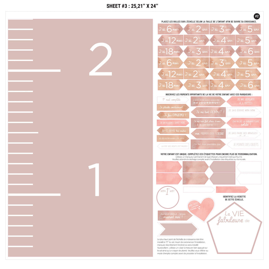 - L’échelle de croissance et tous les éléments décoratifs sont livrés sur trois feuilles de vinyle autocollant de 27 X 12 pouces (69 X 30 cm) chacune, le tout roulé dans une boîte de carton solide