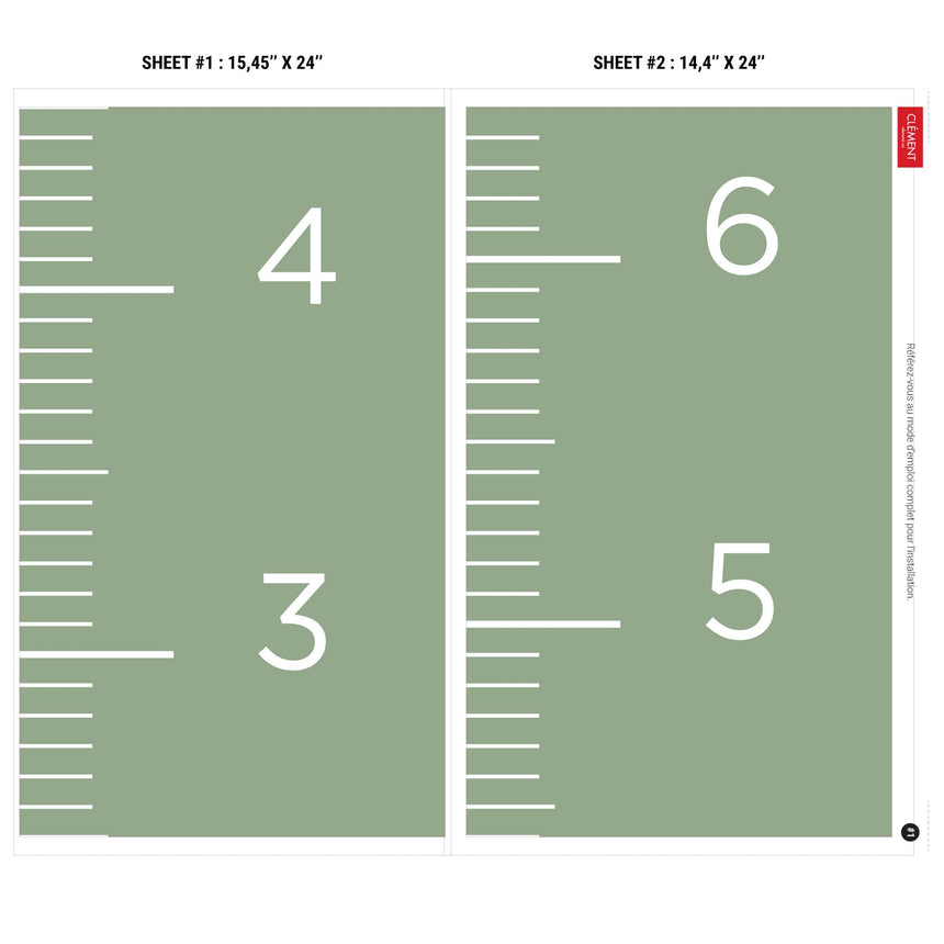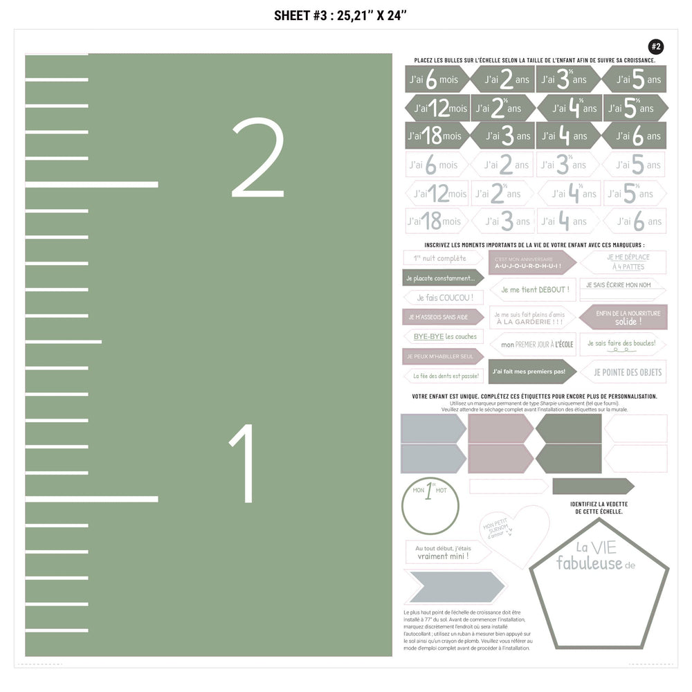 - L’échelle de croissance et tous les éléments décoratifs sont livrés sur trois feuilles de vinyle autocollant de 27 X 12 pouces (69 X 30 cm) chacune, le tout roulé dans une boîte de carton solide