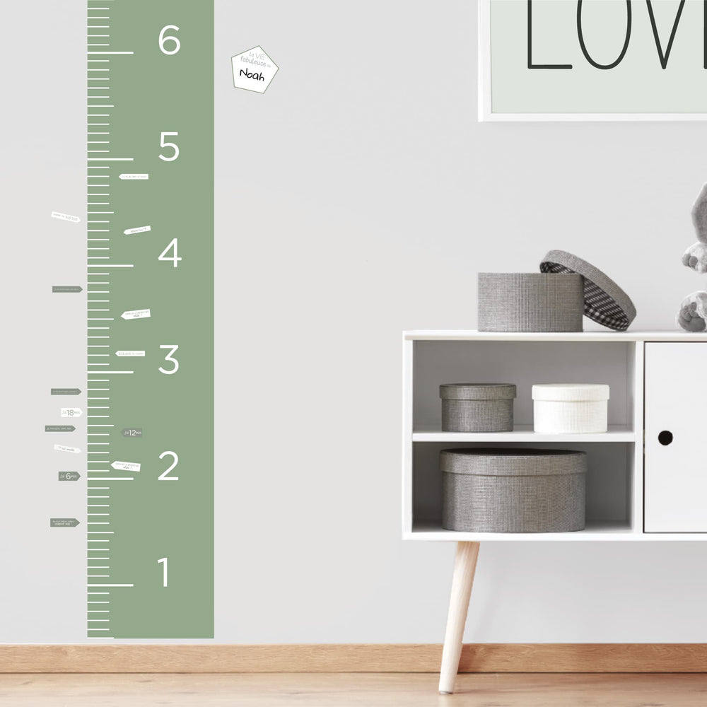 - L’échelle de croissance pourra être conservée en souvenir une fois décollée du mur. Pour ce faire, assurez-vous de conserver le support papier afin de recoller les autocollants.